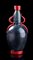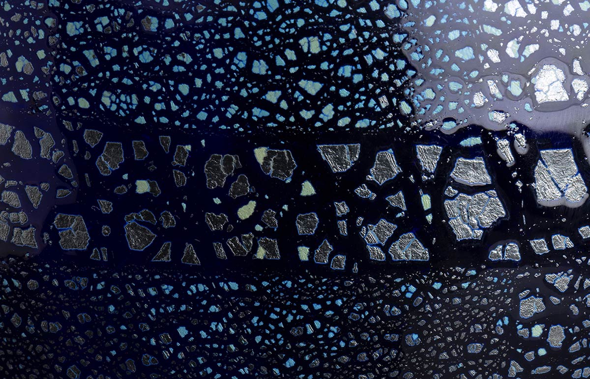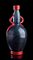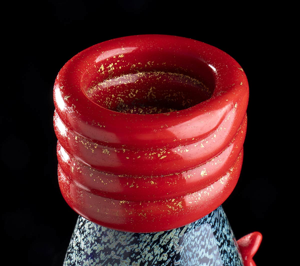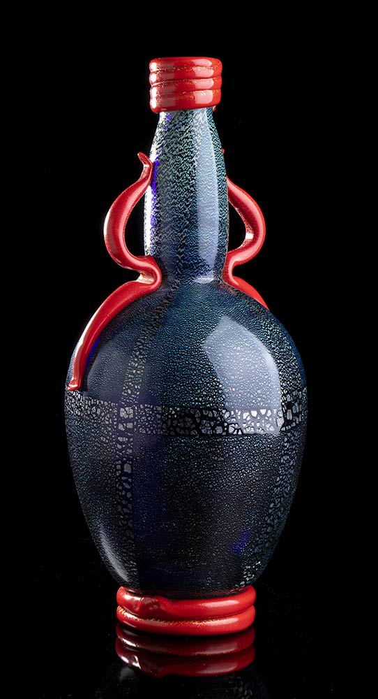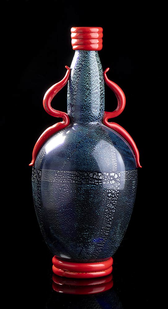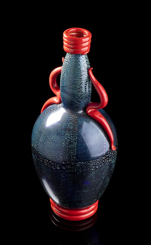 Vaso in vetro soffiato nero con decori in argento, applicazioni in pasta rossa