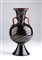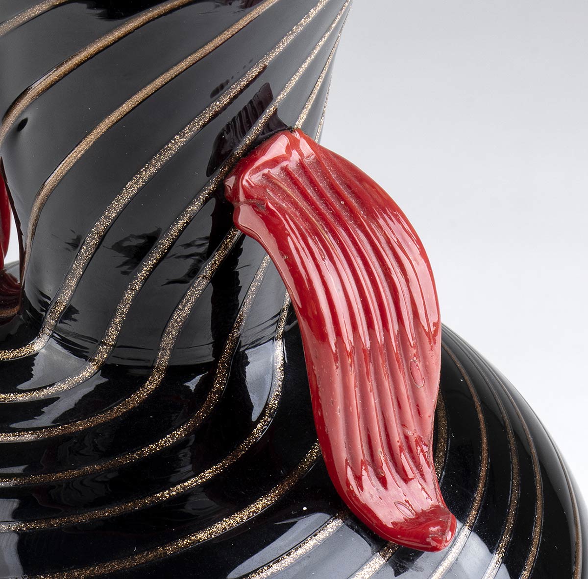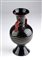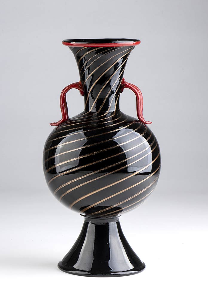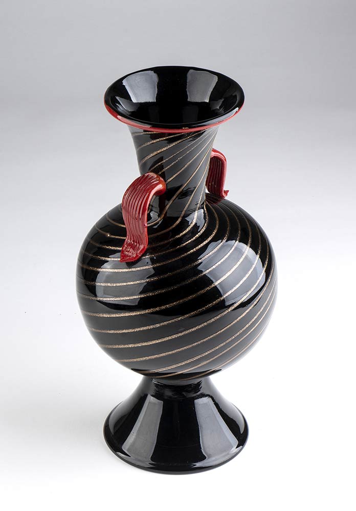 Vaso in vetro soffiato nero con decori in argento, applicazioni in pasta rossa