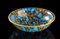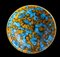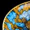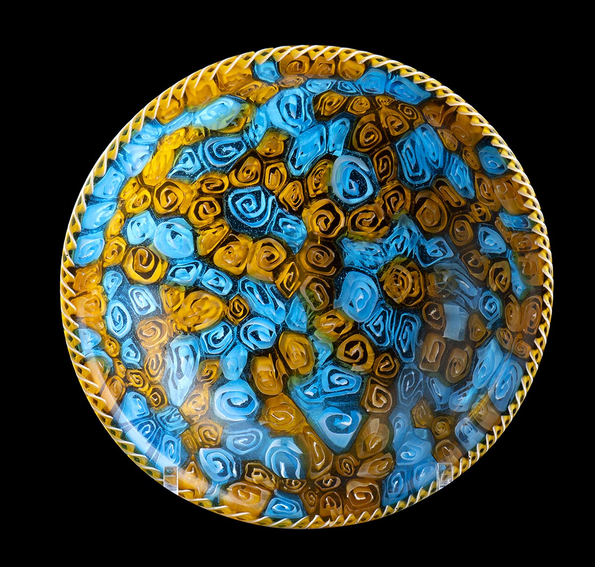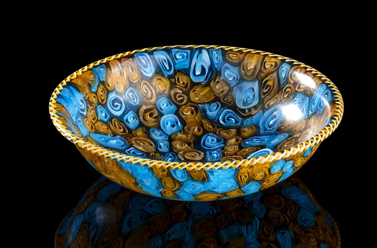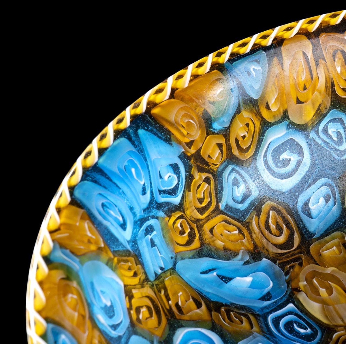Manufatto in vetro mosaico a tessere a spirale e a millefiori in arancio e turchese, bordo a canna ritorta
