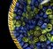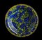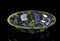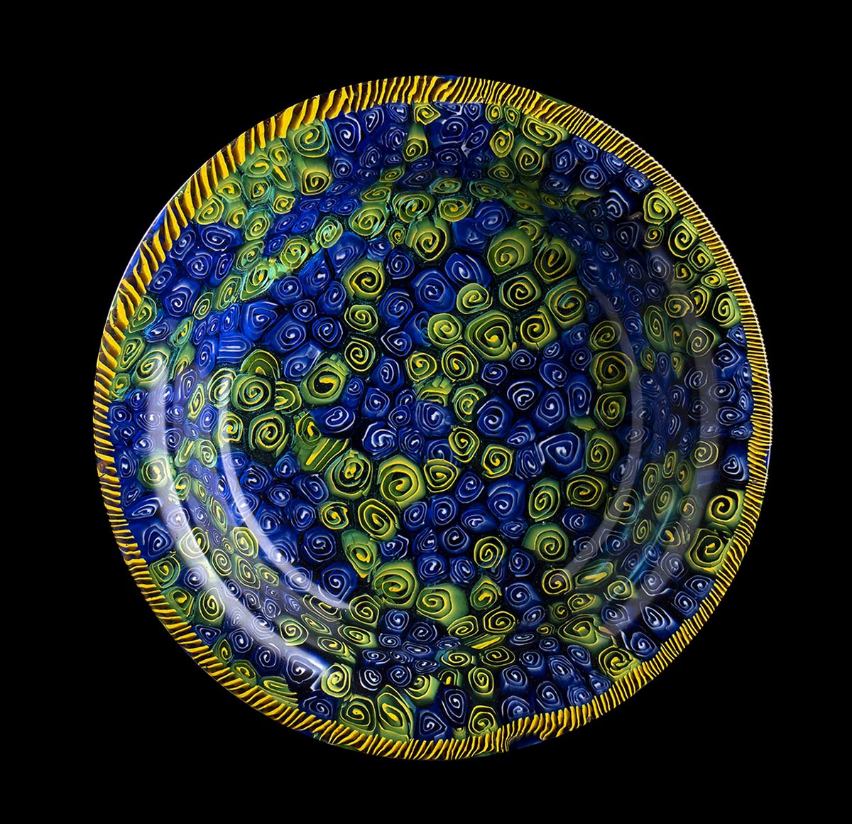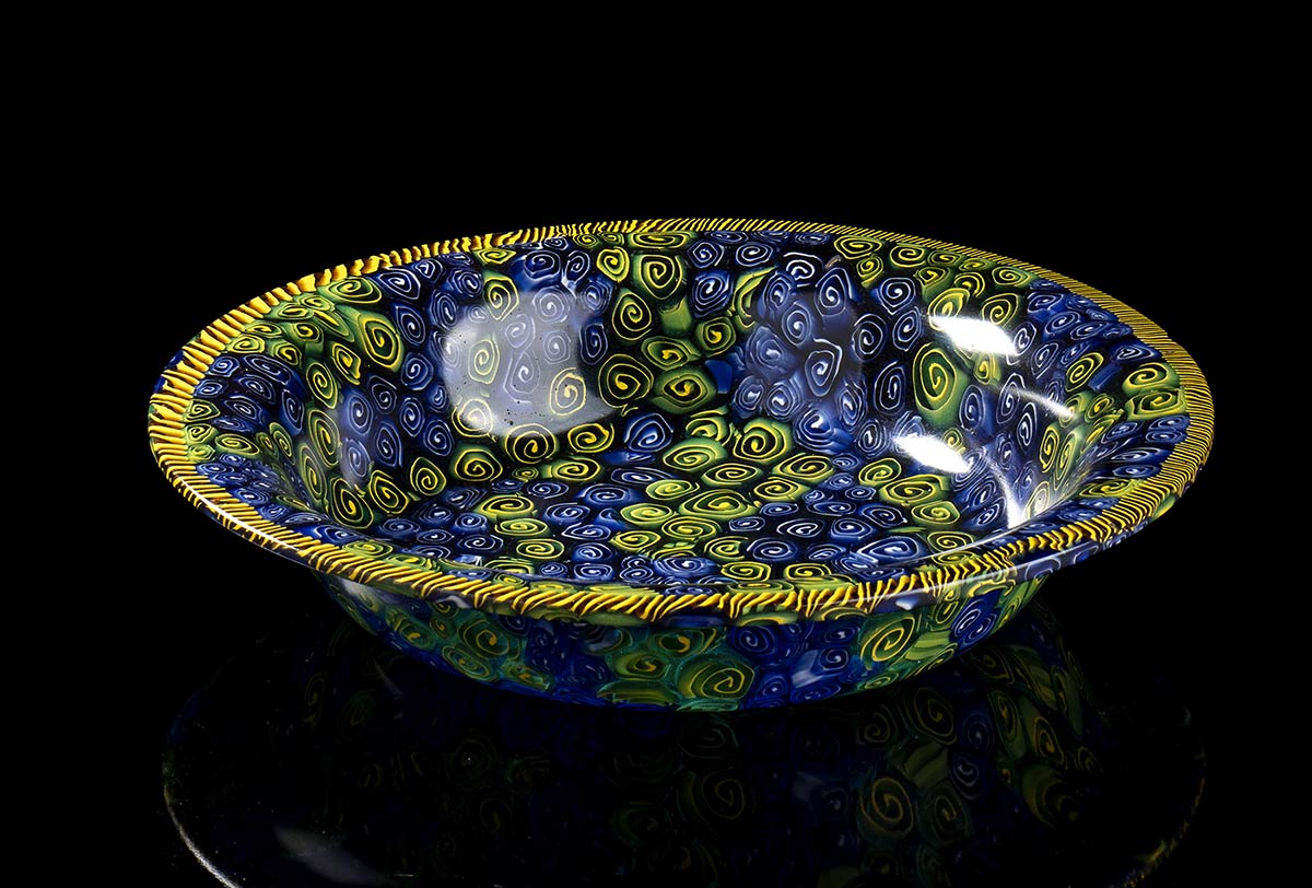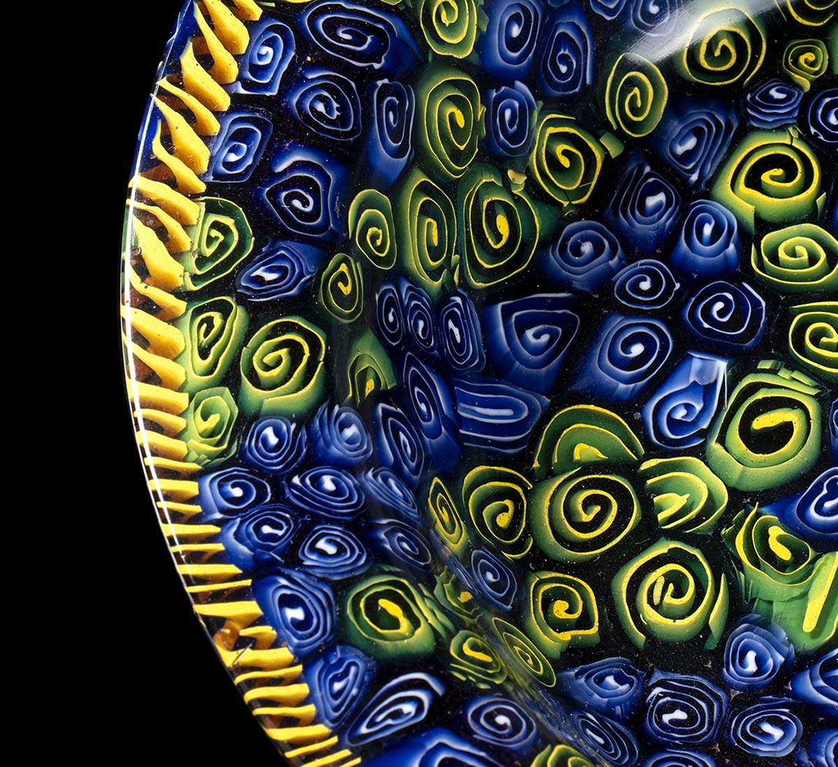 Manufatto in vetro mosaico o murrino, a tessere a spirale e millefiori in bku, turchese, giallo e verde. Bordo a canna ritorta. A firma VM