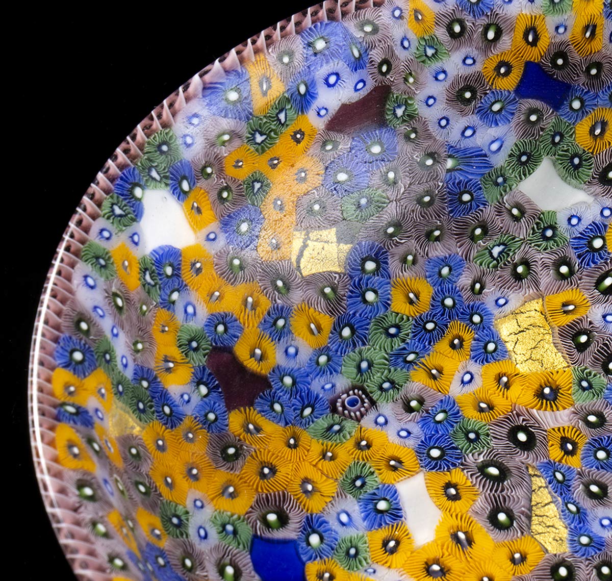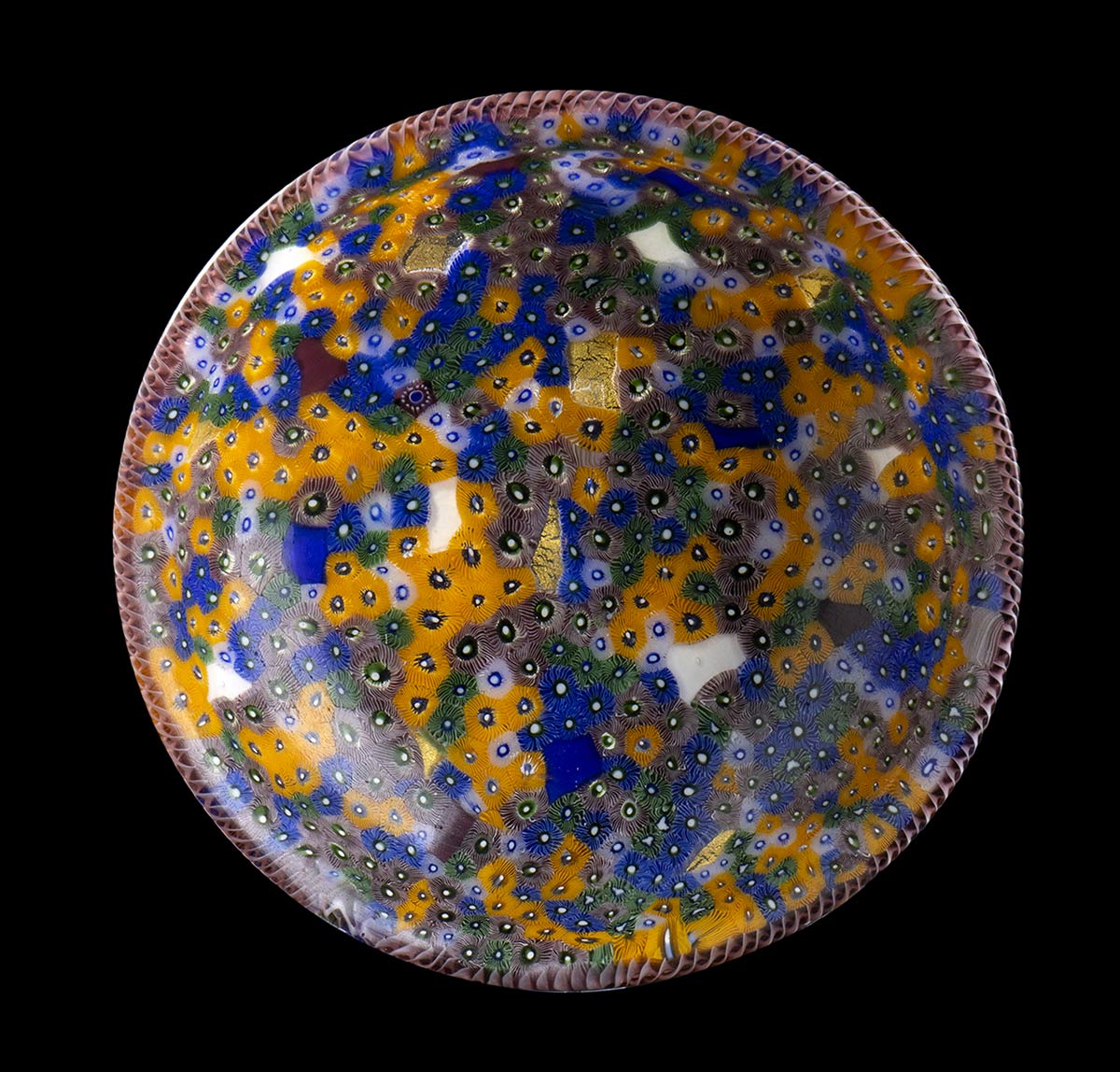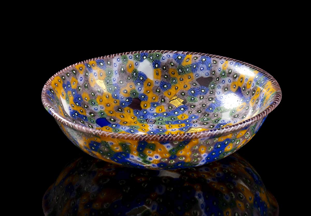 Manufatto in vetro mosaico a tessere a spirale e a millefiori in arancio e turchese, bordo a canna ritorta