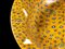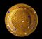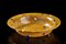 Manufatto in vetro mosaico o murrino a tessere lamellari giallo ocra con al centro due strati concentrici di vetro nero su bianco. Nella trama sono stati inseriti frammenti azzurri, oro, lattimo e ametista