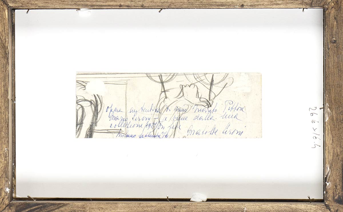 Al retro, autentica della moglie dell'artista Matilde Sironi e certificato di archiviazione su foto al n.29/17 RA presso l' Associazione per il patrocinio e la promozione della figura e dell'opera di Mario Sironi