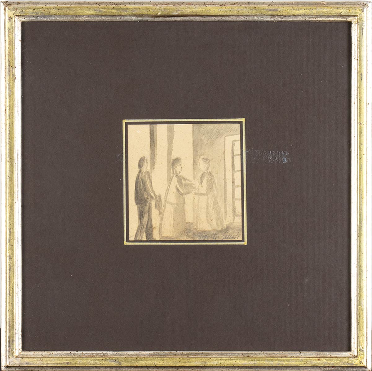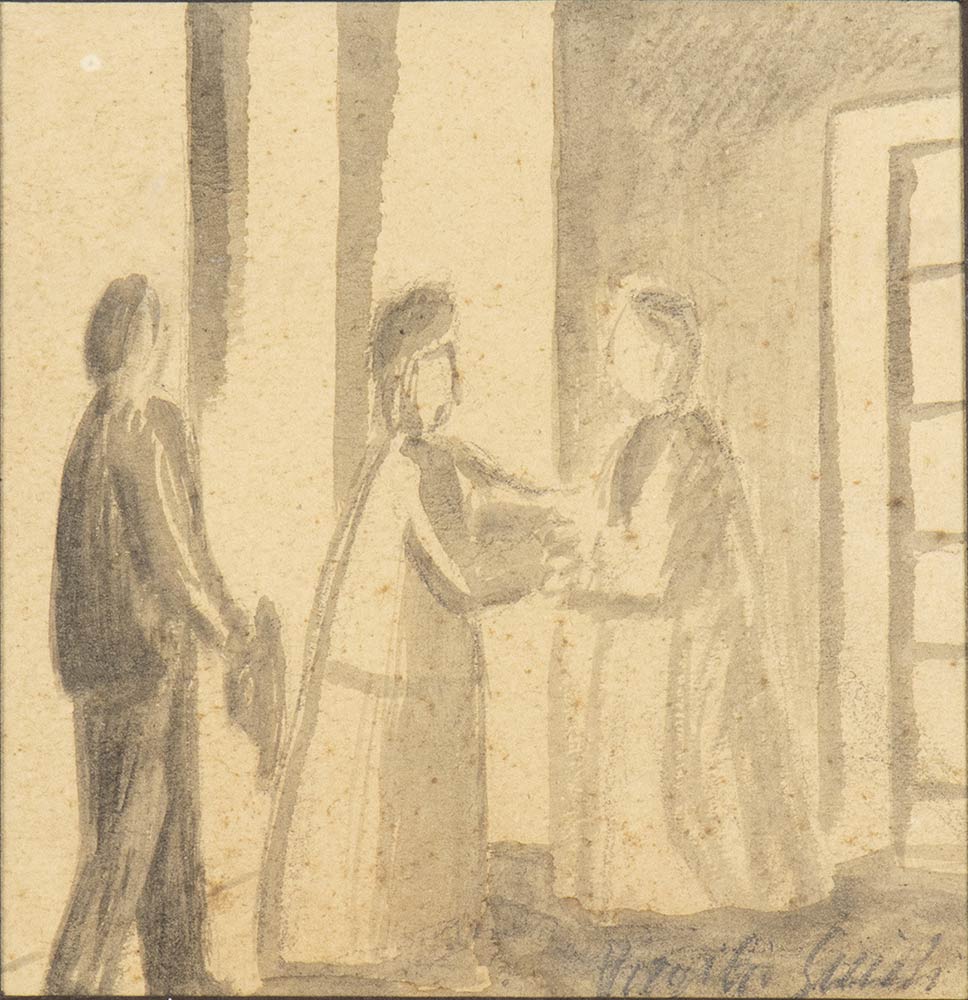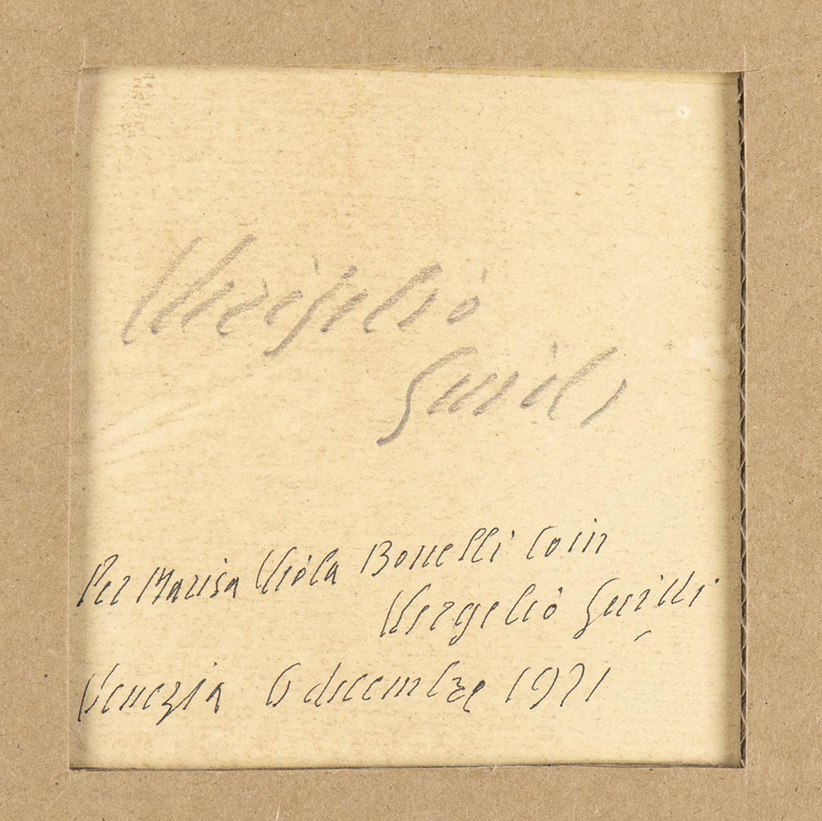 Bozzetto per l'opera "La visita" presentata alla Biennale di Venezia del 1922. Firmato in basso a destra: Virgilio Guidi; firmato al retro: Virgilio Guidi e dedica:"Per Maria Viola Bonelli Coin, Virgilio Guidi, Venezia, 6 dicembre 1921"