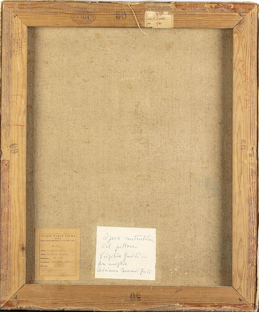 Al retro: etichetta della galleria del Milione di Milano e dello Studio d'arte Palma di Roma e autenticità firmata dalla moglie Adriana Bernardi Guidi