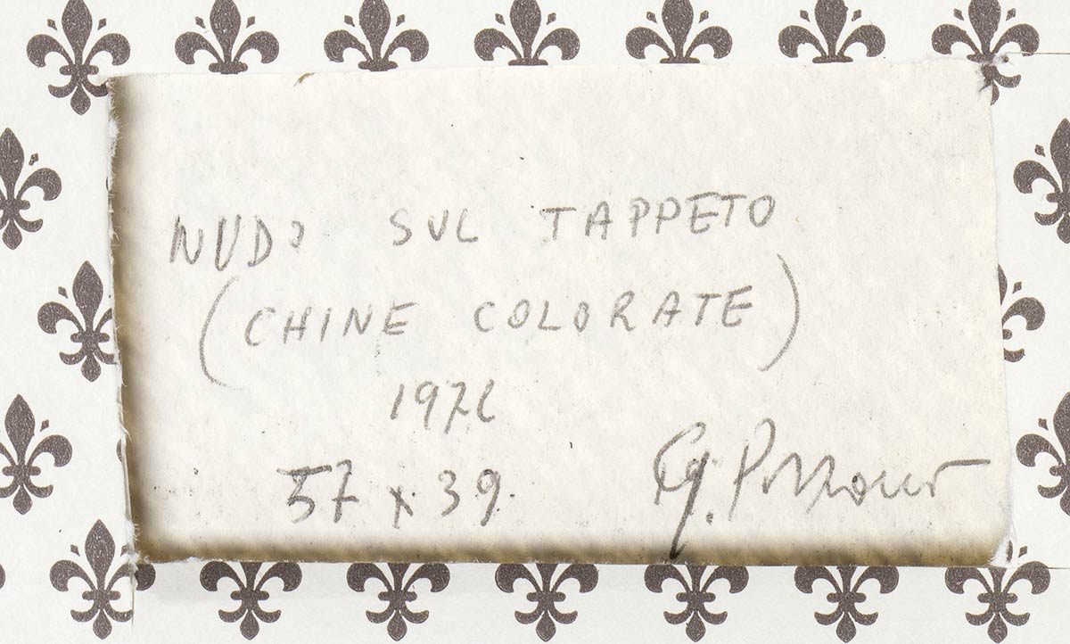 Firmato e datato in alto a destra: Porzano, 1972, firmato, datato e titolato al retro: G. Porzano, 1972, Nudo sul tappeto