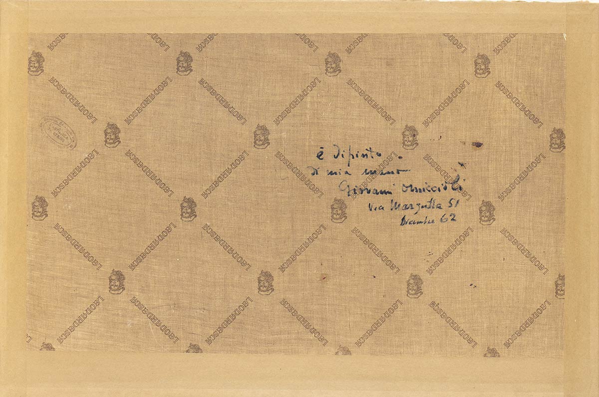 Firmato in basso a destra: G. Omiccioli, firmato e datato al retro:"È dipinto di mia mano, Giovanni Omiccioli, Via Margutta 57, dicembre 62"