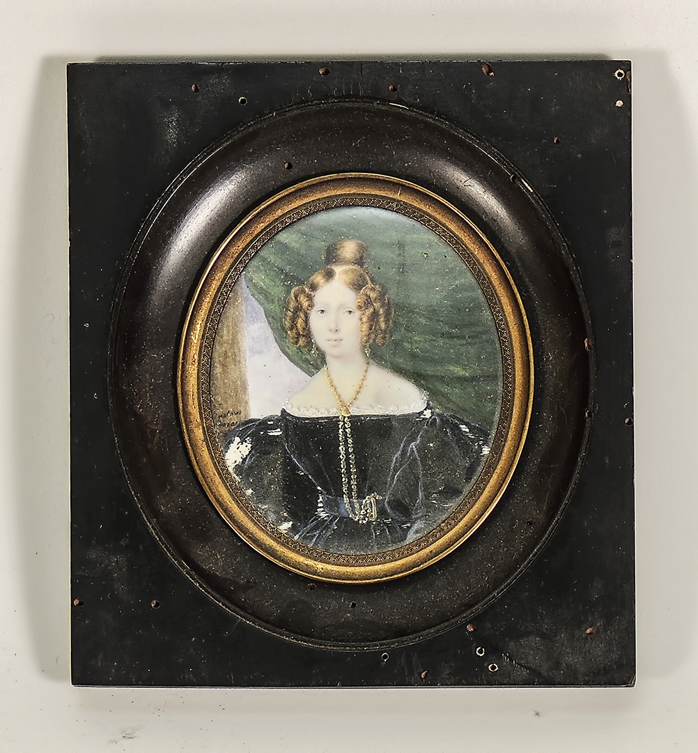 SCUOLA TOSCANA DELLA METÀ DEL XIX SECOLO - TUSCAN SCHOOL OF MID 19TH CENTURY Ritratto di nobildonna - Portait of a Nobelwoman miniatura in ovale su avorio - oval miniature on ivory firmata Gustavo Lazzari, in cornice in legno ebanizzato, difetti cm 9x7,5