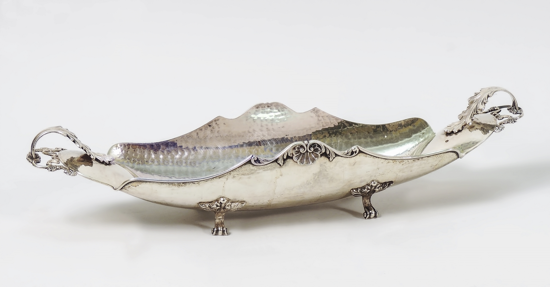 CENTROTAVOLA A NAVICELLA IN ARGENTO MARTELLATO - SILVER PEDESTAL CENTREPIECE corpo allungato, piedini mossi, prese modellate come foglie d'acanto gr 680