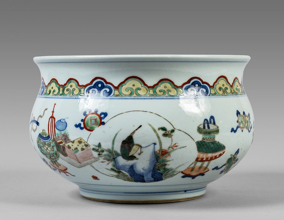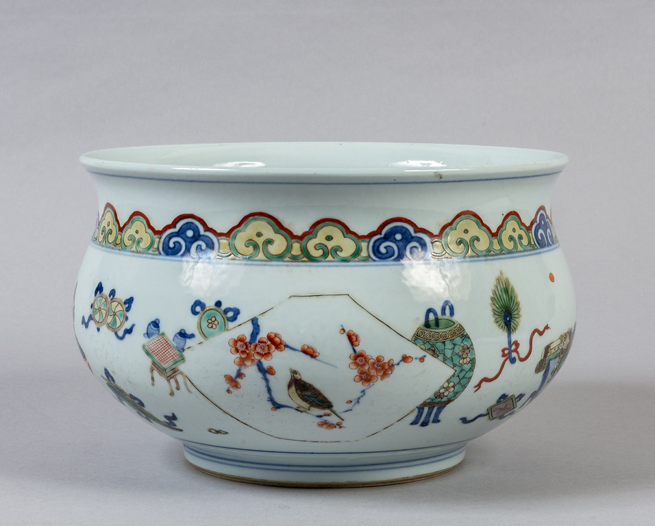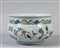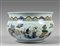 Cachepot in porcellana decorato in policromia con simboli thaoisti marcato sul fondo con il doppio cerchio Cina sec.XIX