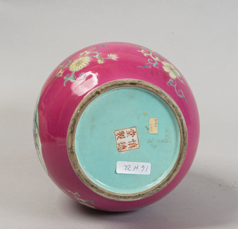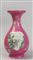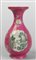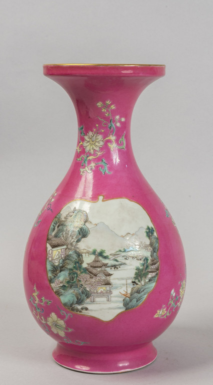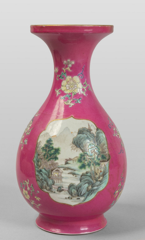 Vaso in porcellana policroma a fondo rosa decorato a riserve di paesaggi con personaggi marcato alla base Cina inizi sec.XX