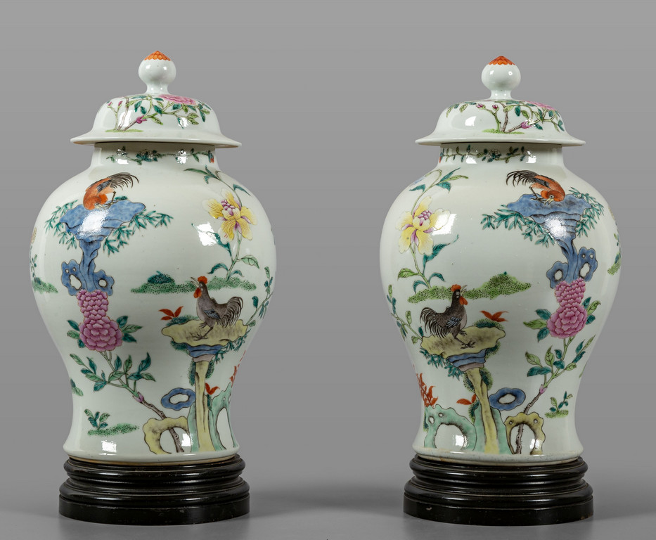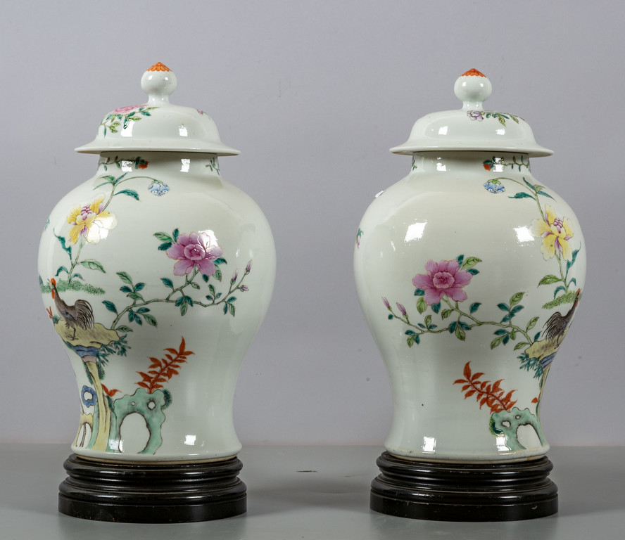 Coppia di potiches in porcellana di Cina decorate in policromia con fiori ed animali su fondo bianco sec.XIX