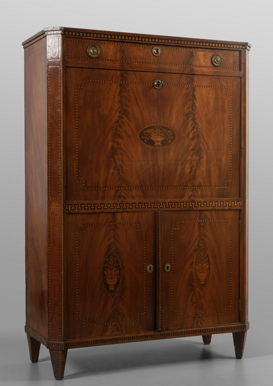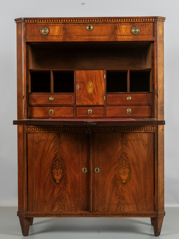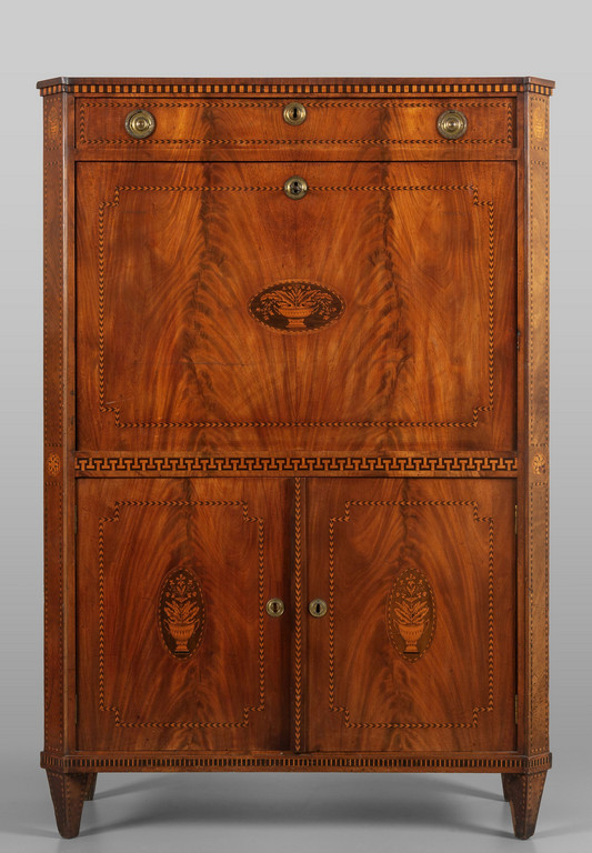 Secretaire lastronato in mogano filettato ed intarsiato a motivi di fiori e greche Olanda sec.XIX