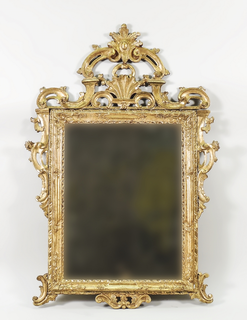 SPECCHIERA IN LEGNO INTAGLIATO E DORATO - GILTWOOD MIRROR fine del XVIII secolo - late 18th Century decoro a volute, cimasa centrata da conchiglia e cascate laterali cm 91x35