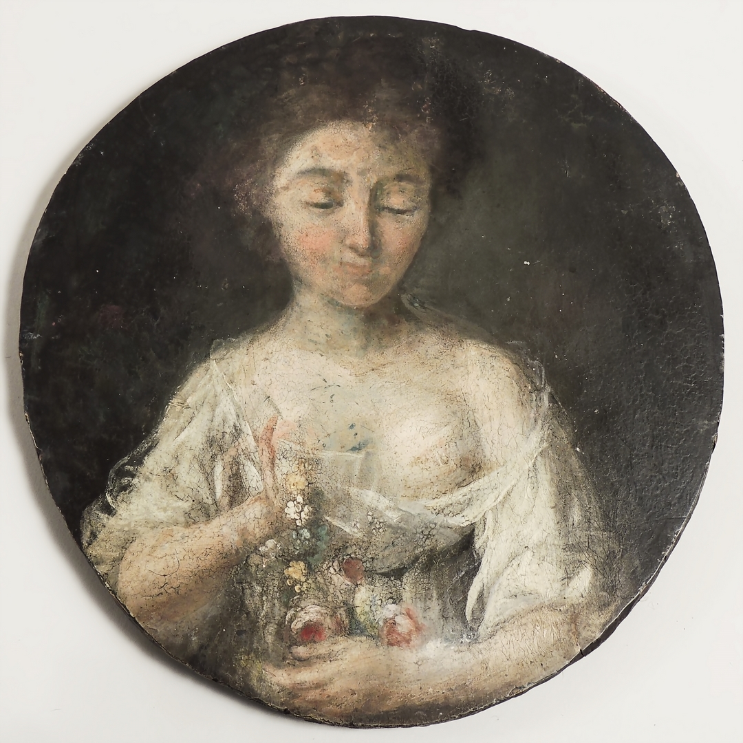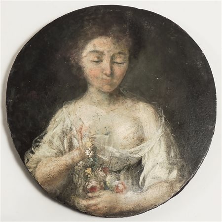 RITRATTO DI DAMA CON FIORI - PORTRAIT OF A LADY WITH FLOWERS XIX secolo - 19th century olio su tavola circolare - oil on round panel diam cm 23
