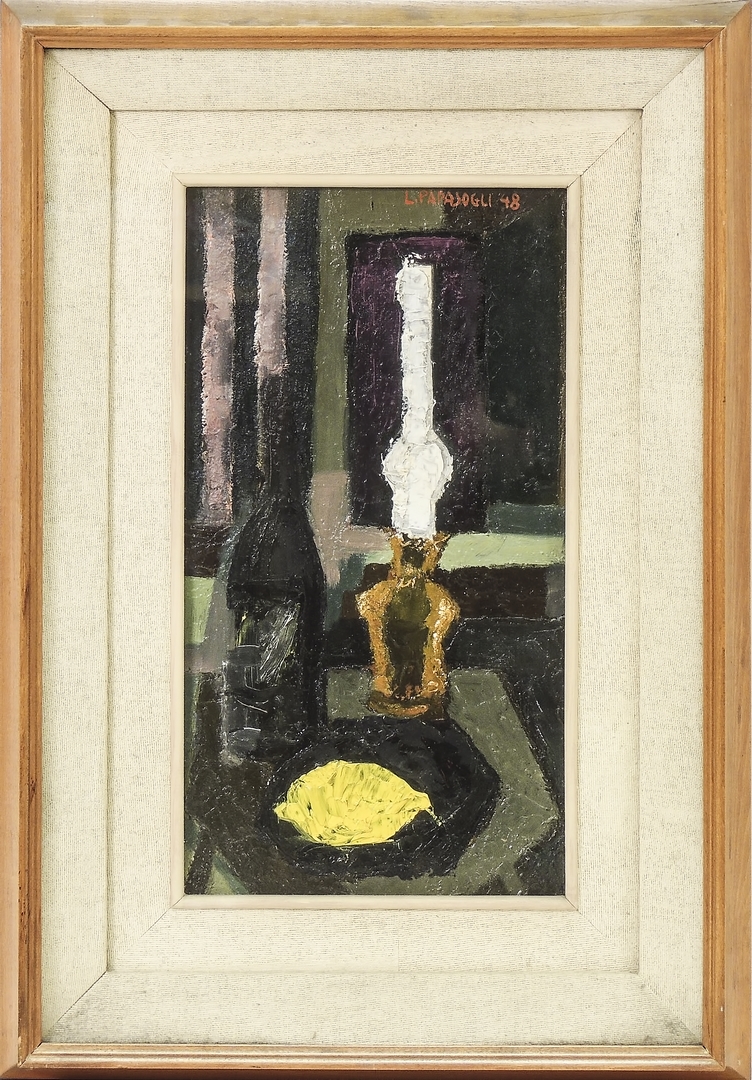 LEONARDO PAPASOGLI Natura morta - Still Life olio su cartone - oil on cardboard, firmato e datato 48, in cornice cm 40x22