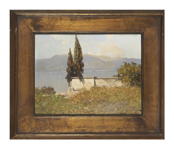 Bruto Mazzolani "Onno, Pino solitario" Lago di Lecco olio su compensato (cm 30x4