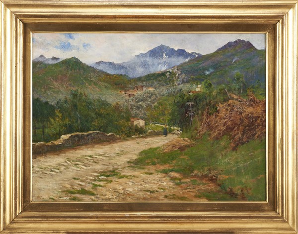 Adolfo Tommasi "Villaggio apuano" olio su tela (cm 51x70) Reca firma non coeva