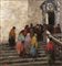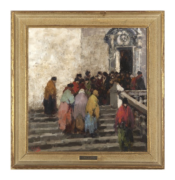 Vincenzo Irolli "Fuori dalla chiesa" olio su tela (cm 50x48) Firmato in basso a