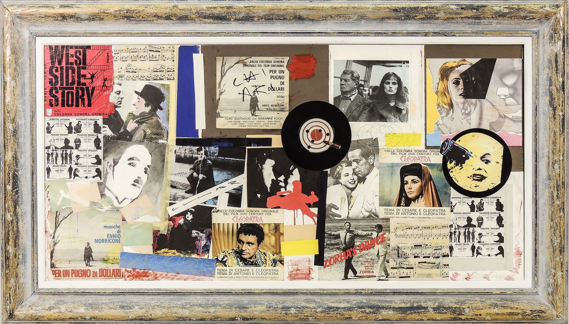 GIUSEPPE CHIARI (1926-2007) Composizione con dischi - Composition with LP tecnica mista su tela - mixed media on canvas, firmato, in cornice cm 60x120