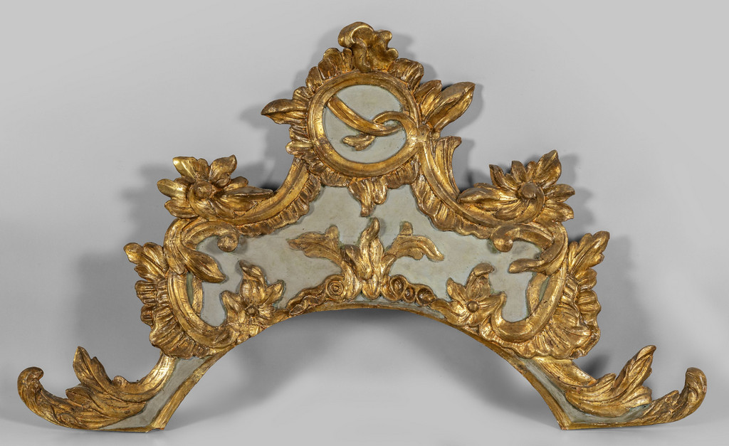 Fregio Luigi XIV sovraporta in legno intagliato dorato e laccato sec.XVIII