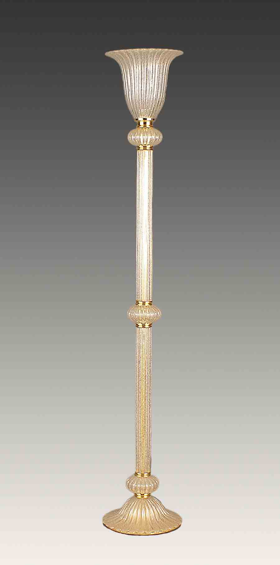 Lampada piantana in vetro trasparente e parzialmente dorato con diffusore a lampada, manifattura di Murano, h. cm 185.