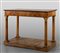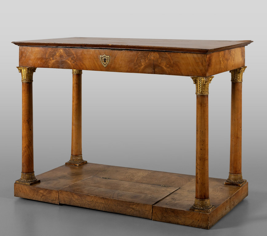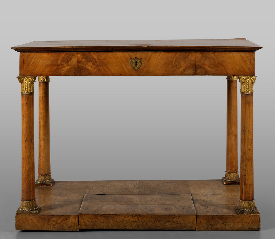 Scrivania Impero lastronata in radica a quattro gambe tornite che sorreggono un piano che cela all'interno uno scrittoio serratura con scritta: fatto dalla Fabbrica di Pietro Massagli ebanista lucchese 1812