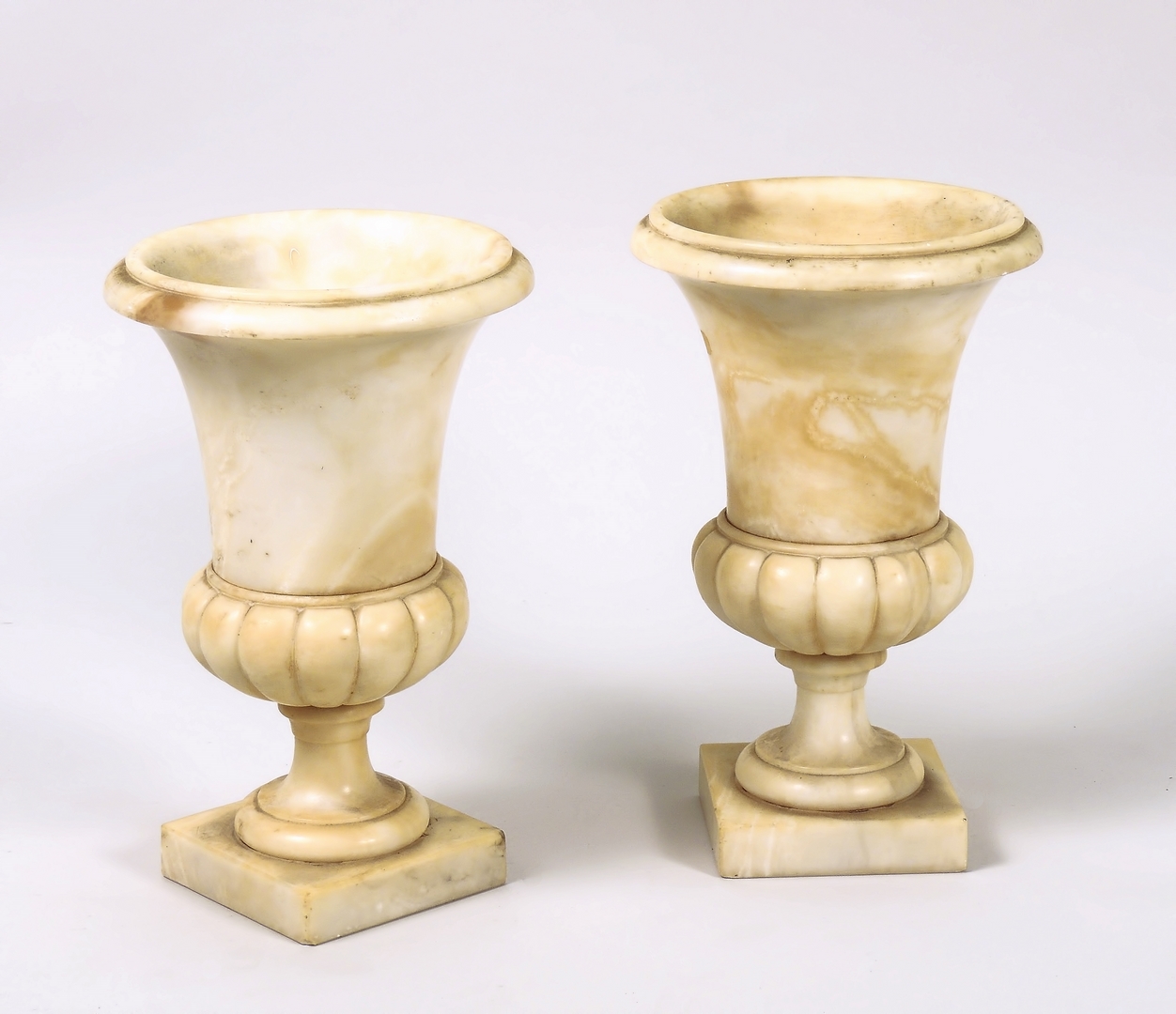 COPPIA DI VASI MEDICEI IN ALABASTRO - PAIR OF ALABASTER VASES MEDICI-STYLE fascia baccellata h cm 28