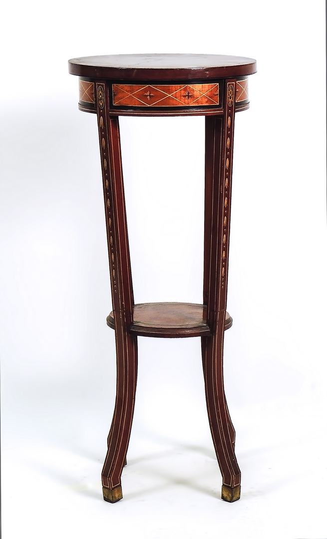 GUERIDON IMPIALLACCIATO IN CILIEGIO - CHERRYWOOD VENEERED COFFEE TABLE dipinto a finto intarsio con motivi floreali sulla fascia e sulle gambe, pianetto circolare, quattro gambe mosse riunite da un ripiano h cm 69