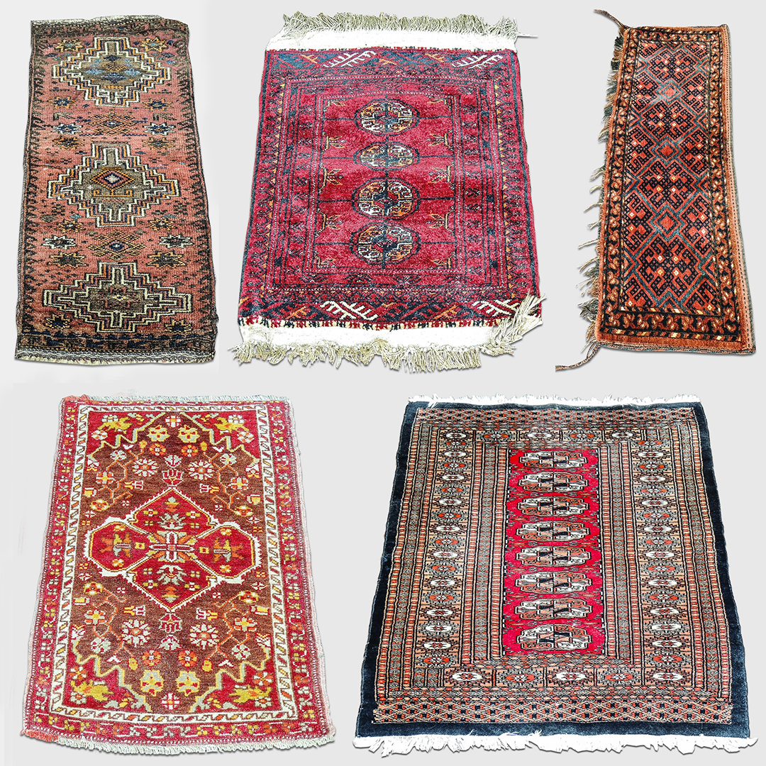 LOTTO - LOT quattro piccoli tappeti d'epoca, dei quali due persiani, uno afghano e uno pakistano, ed una sella, tutti nei toni del rosso e del marrone (5)