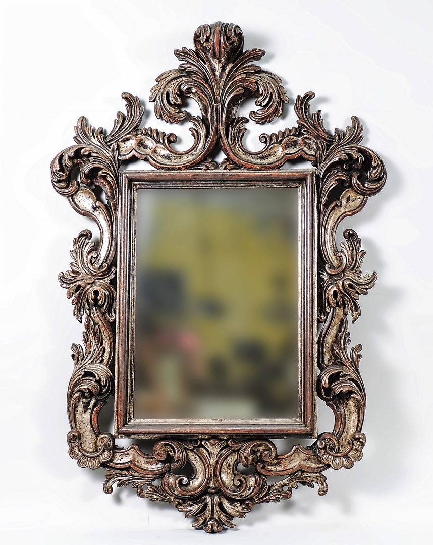 SPECCHIERA IN LEGNO INTAGLIATO E ARGENTATO - GILTWOOD MIRROR realizzata in stile seicentesco con volute e foglie d'acanto cm 114x74