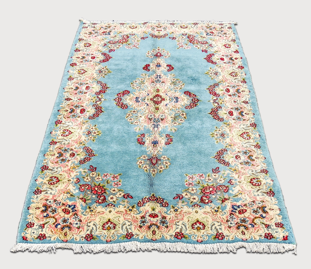 TAPPETO PERSIANO KIRMAN - PERSIAN KIRMAN RUG fondo azzurro a tinta unita, medaglione centrale e alta bordura a motivo floreale nei toni del rosa e beige cm 235x126