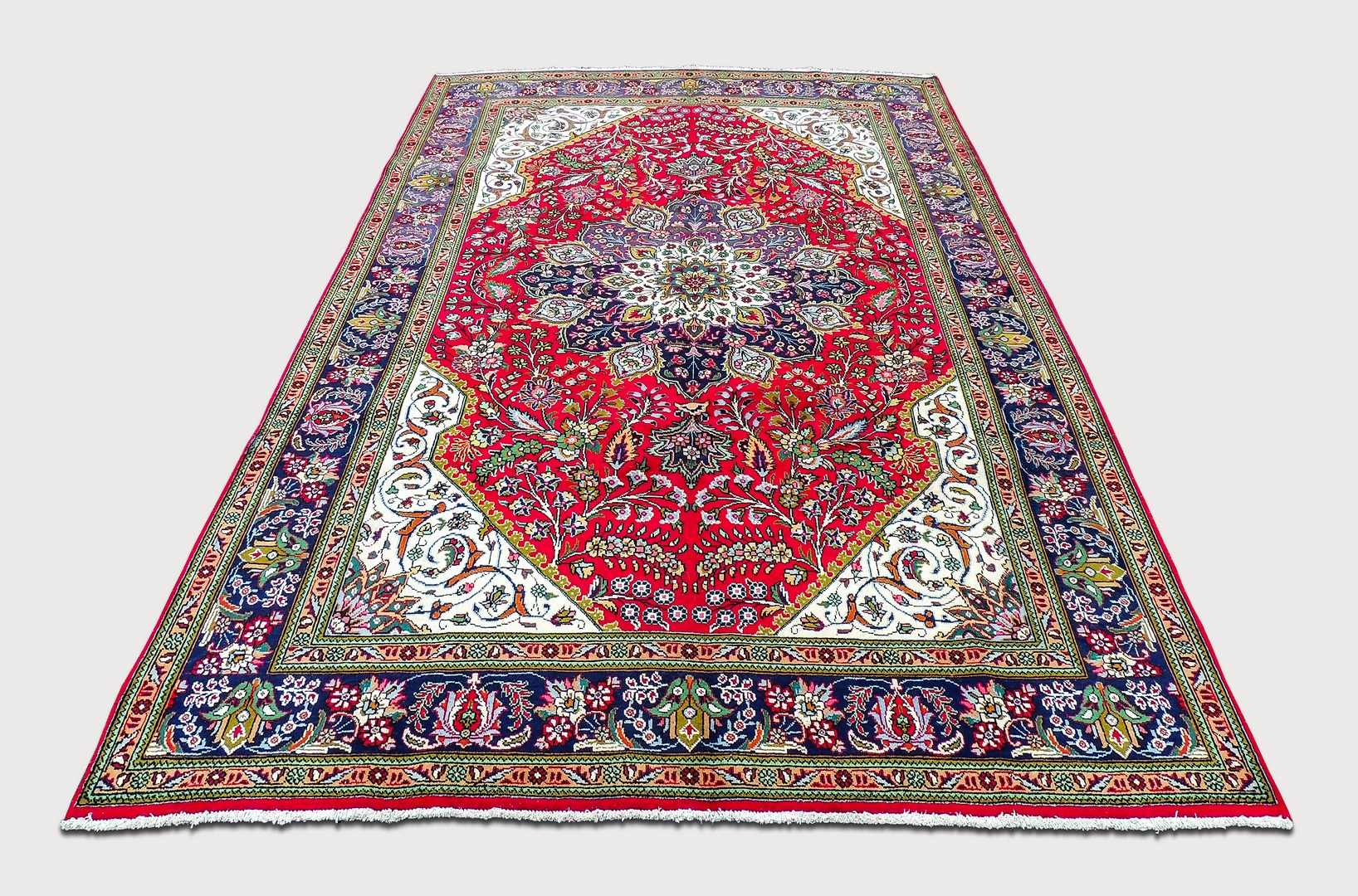 TAPPETO PERSIANO TABRIZ - OLD PERSIAN TABRIZ CARPET vecchia manifattura, fondo rosso e avorio, campo a motivo floreale con medaglione centrale nei toni del verde, blu e gialle, bordura blu cm 340x250