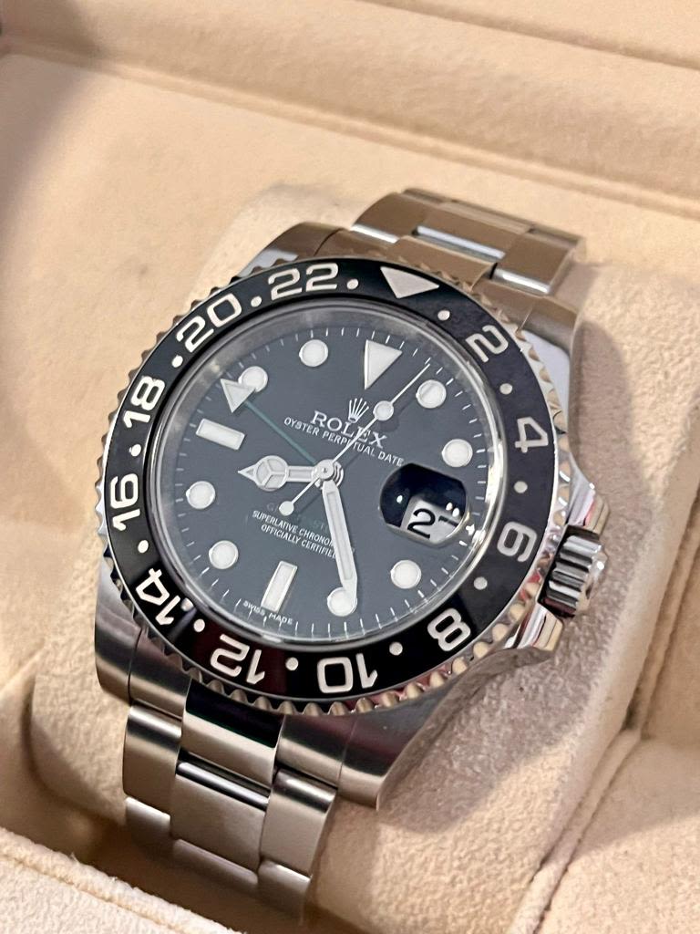 Marca Rolex Modello (Orologio) GMT-Master II Numero di referenza 116710LN Carica Automatico Materiale della cassa Acciaio Materiale cinturino Acciaio Anno di produzione 2016/2019 Condizione ECCELLENTE Corredo Con scatola di fornitura e documenti originali, Garanzia Rolex Carica Automatico Cassa Materiale della cassa Acciaio Diametro 40 mm Prova Impermeabile 10 ATM Materiale lunetta Ceramica Vetro zaffiro Quadrante Nero Numeri sul quadrante Senza numeri Cinturino Materiale Acciaio Colore cinturino Acciaio Chiusura Déployante Materiale chiusura Acciaio Funzioni Data, GMT