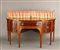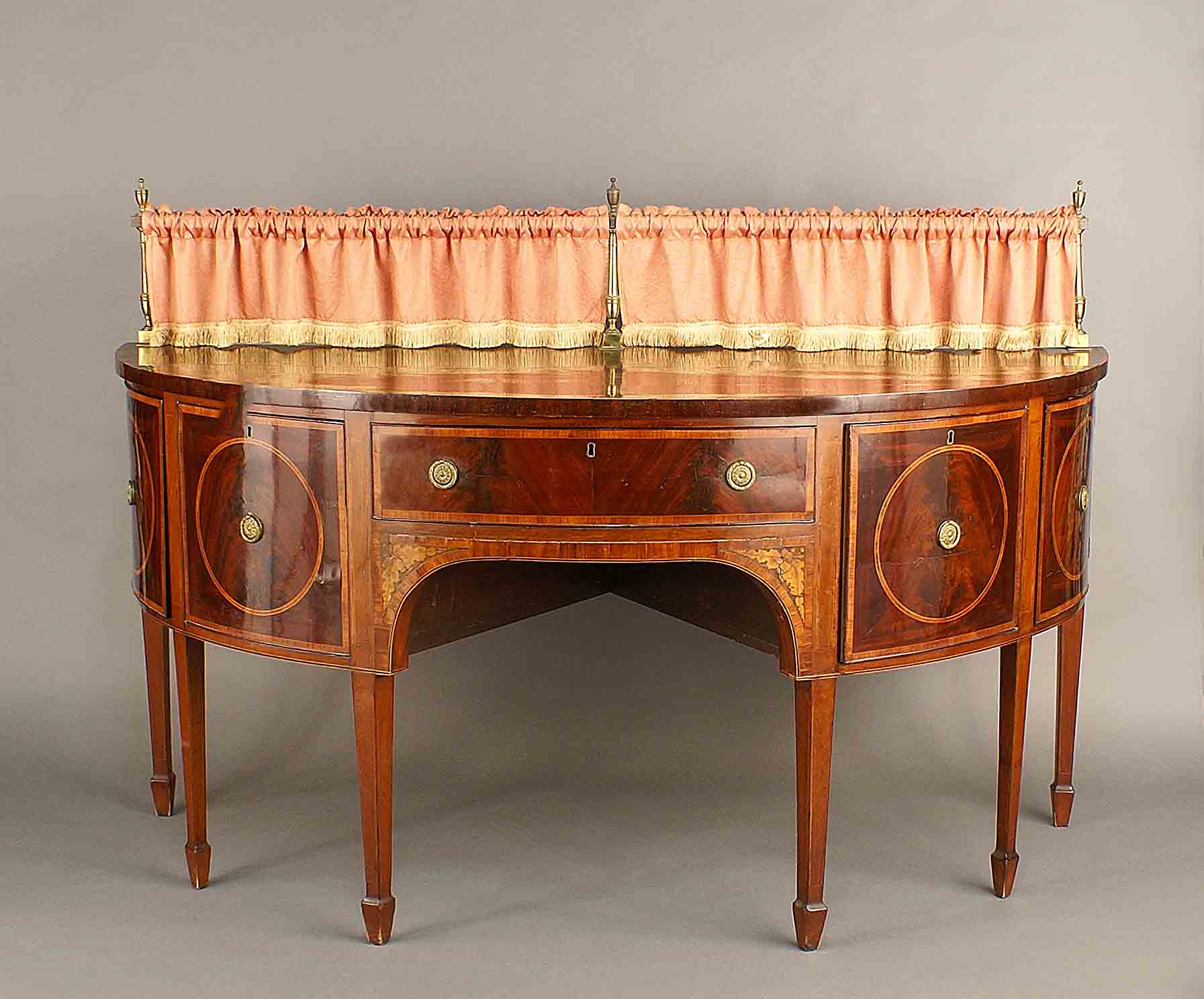 Mobile "sideboard" in mogano e piuma di mogano filettato ed intarsiato in bois de rose e legni di frutto, piano a mezza luna con alzata in bronzo dorato e tessuto, quattro sportelli ed un cassetto sottostante, Inghilterra XIX secolo, cm. 123x185x76.
