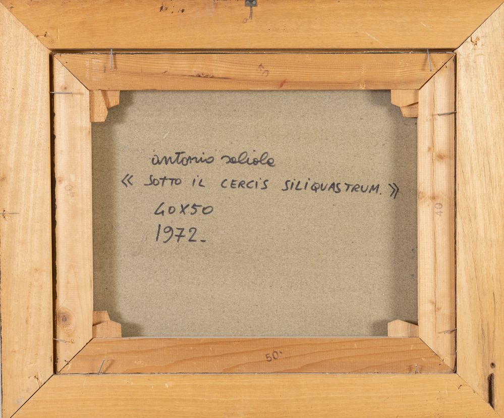 ANTONIO SALIOLA (Bologna 1939) "Sotto il cercis siliquastrum", 1972. Olio su tela. Cm 40x50. Opera firmata e datata in basso a destra Saliola 1972. Al retro opera firmata, intitolata e datata Antonio Saliola, Sotto il cercis siliquastrum, 1972.