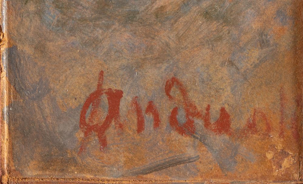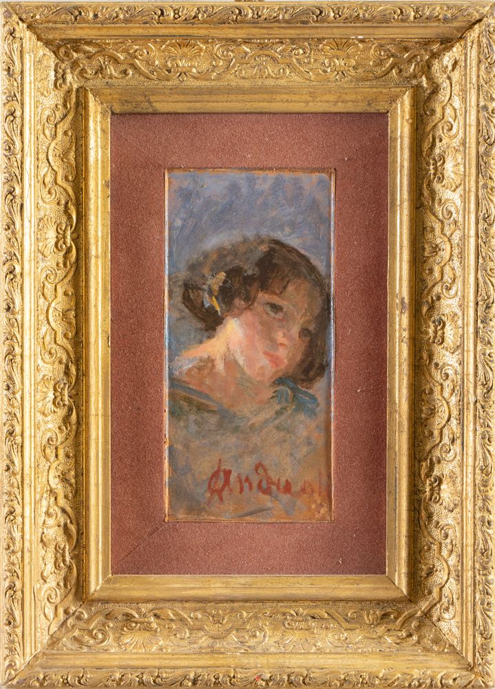 ATTILIO ANDREOLI (Chiari 1877 – Verbania 1950) "La bimba". Olio su cartone. Cm 21x10.