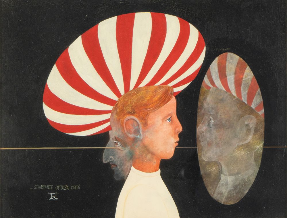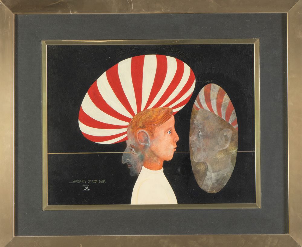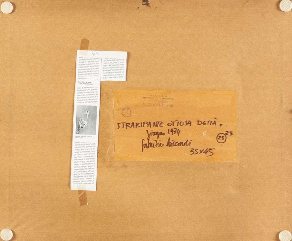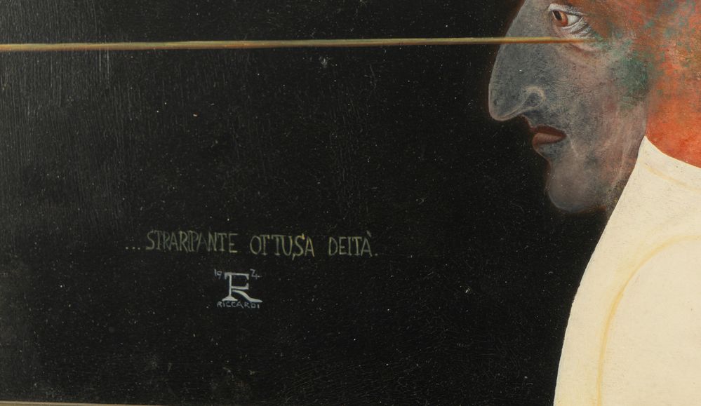 FABRIZIO RICCARDI (Roma 1942) "Straripante ottusa deità", 1974. Olio su tela. Cm 35x45. Opera firmata, datata e intitolata in basso a sinistra R, Riccardi, 1974, Straripante ottusa deità. Al retro opera firmata, datata e intitolata Fabrizio Riccardi, 1974, Straripante ottusa deità.