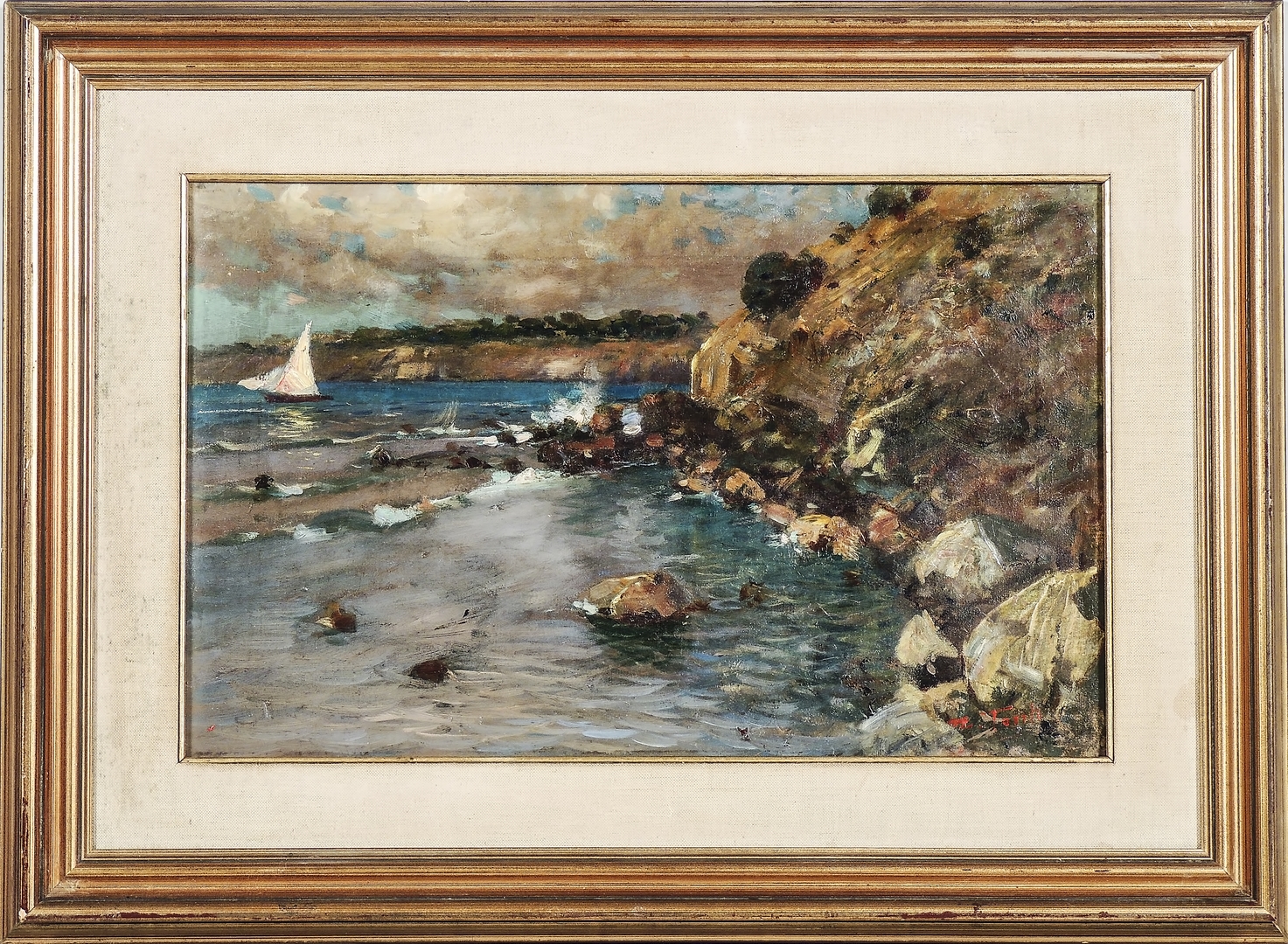 EGISTO TONTI (1887-1922) Marina ad Antignano - Antignano View olio su tela - oil on canvas, firmato, in cornice cm 32x50 Al verso reca cartiglio - With label on reverse