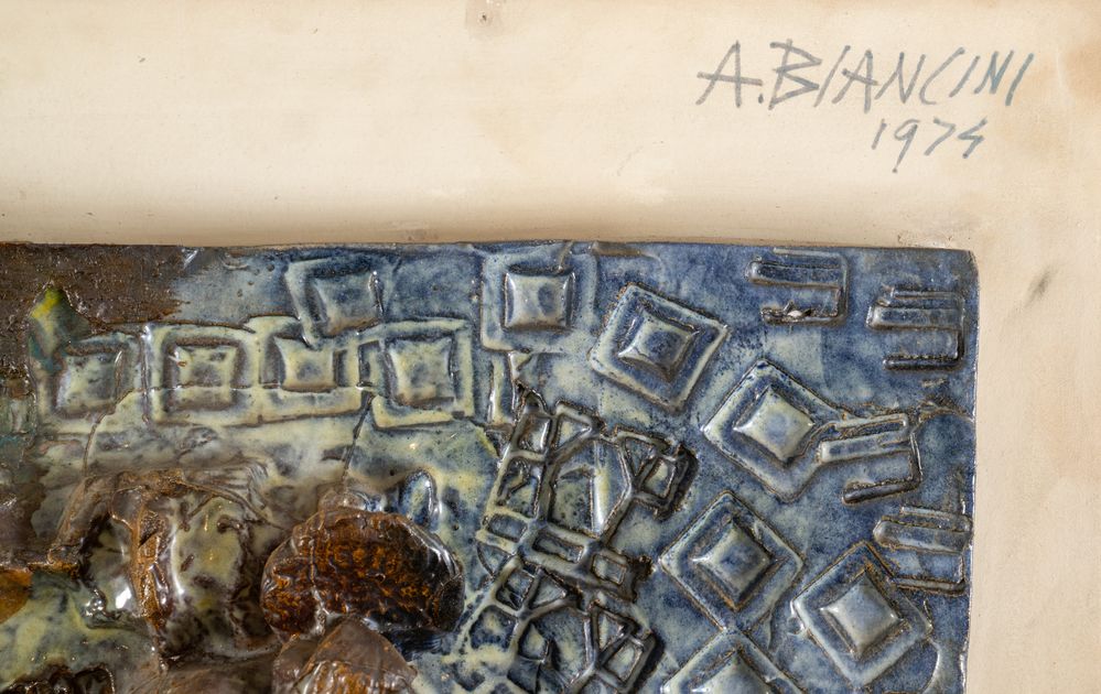 ANGELO BIANCINI (Castel Bolognese 1911 – 1988) "Senza titolo", 1974. Altorilievo in ceramica policroma. Cm 38x58. Opera firmata e datata in alto a destra A. Biancini 1974.