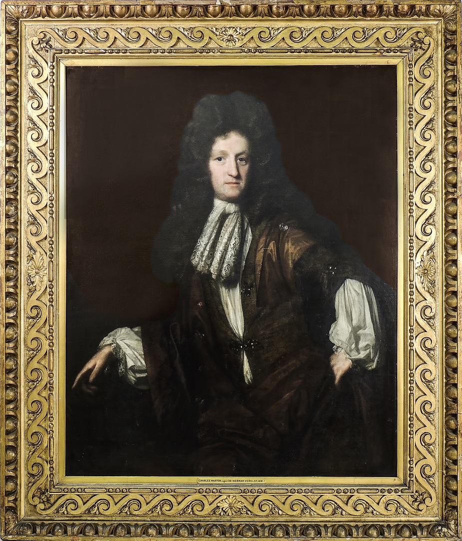 HERMAN VERELST (ca 1642-1702) Ritratto di Charles Warton - Portrait of Charles Warton olio su tela - oil on canvas, in cornice cm 102,5x125 Al verso sul telaio e sulla tela reca iscritto: ''Maione London'' e ''Maione''