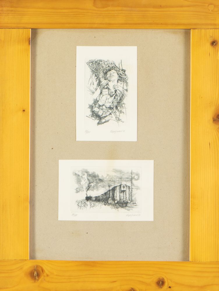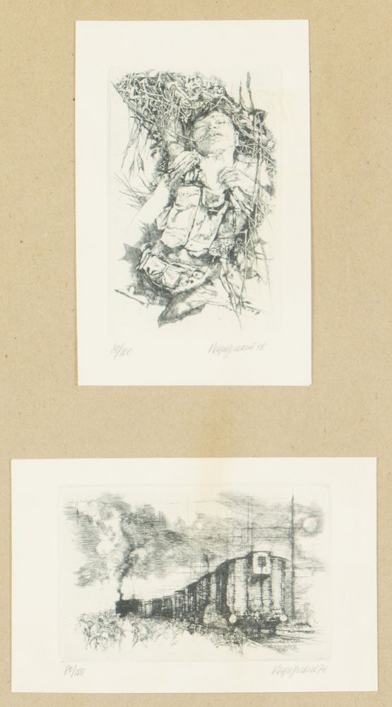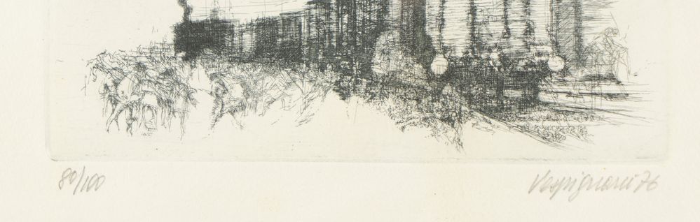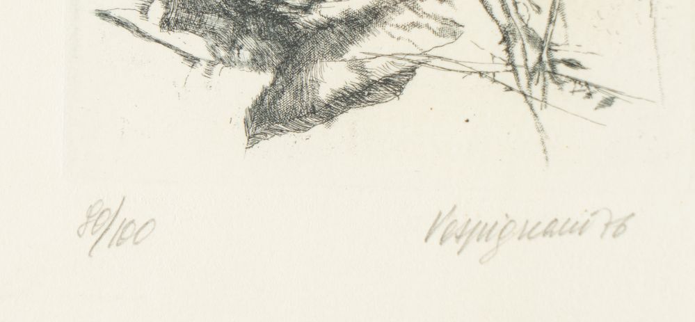 RENZO VESPIGNANI (Roma 1924 – 2001) Coppia di incisioni su carta. Rispettivamente di foglio: cm 18,5x12; lastra: cm 13,5x8,7 e foglio: cm 11,5x18,5; lastra: cm 8,7x13,7. Entrambe le opere sono firmate e datate in basso a destra Vespignani '76. Entrambe le opere recano numeri di tiratura in basso a sinistra 80/100.