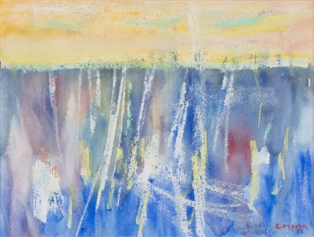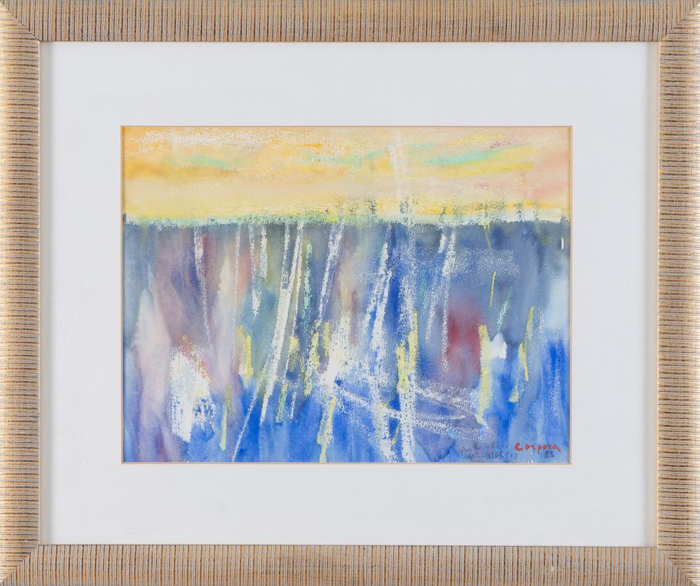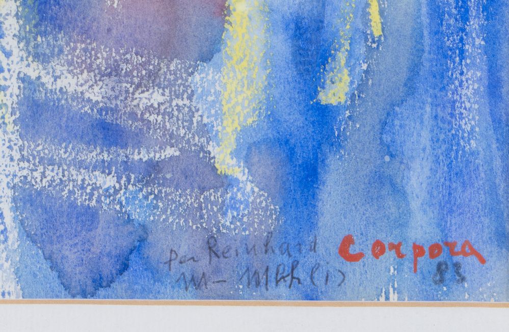ANTONIO CORPORA (Tunisi 1909 - Roma 2004) "Senza titolo", 1983. Acquerello su carta. Cm 30x40. Opera firmata e datata in basso a destra Corpora 83. Al retro reca scritte Pastello e acquerello 1984. Al retro reca numero 255/103001076. Opera accompagnata da lettera dell'Archivio Antonio Corpora.