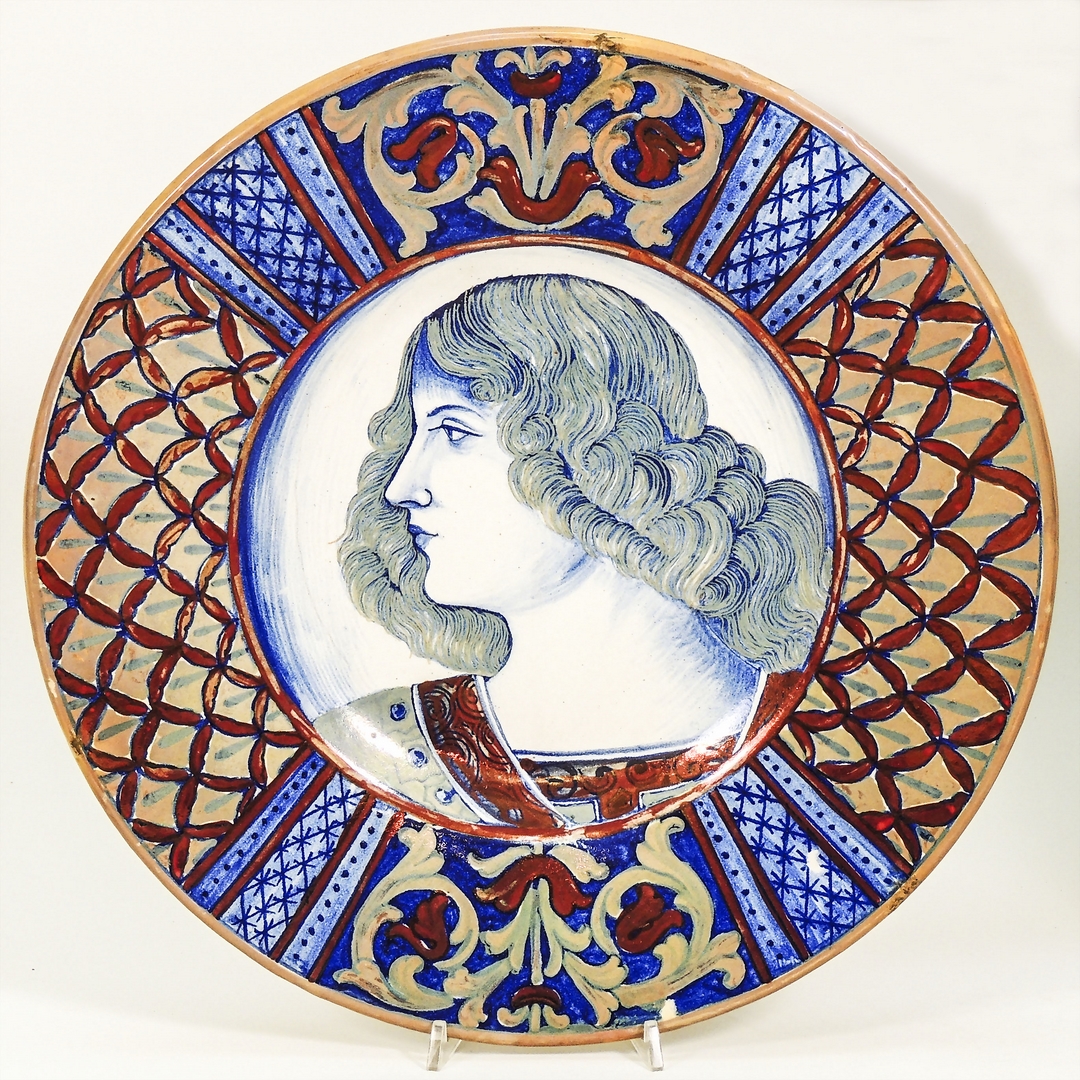 PIATTO DA PARATA IN MAIOLICA POLICROMA - PAINTED MAJOLICA PLATE Gualdo Tadino, inizio del XX secolo - early 20th Century dipinto in stile neorinascimentale con al centro profilo femminile diam cm 38,5