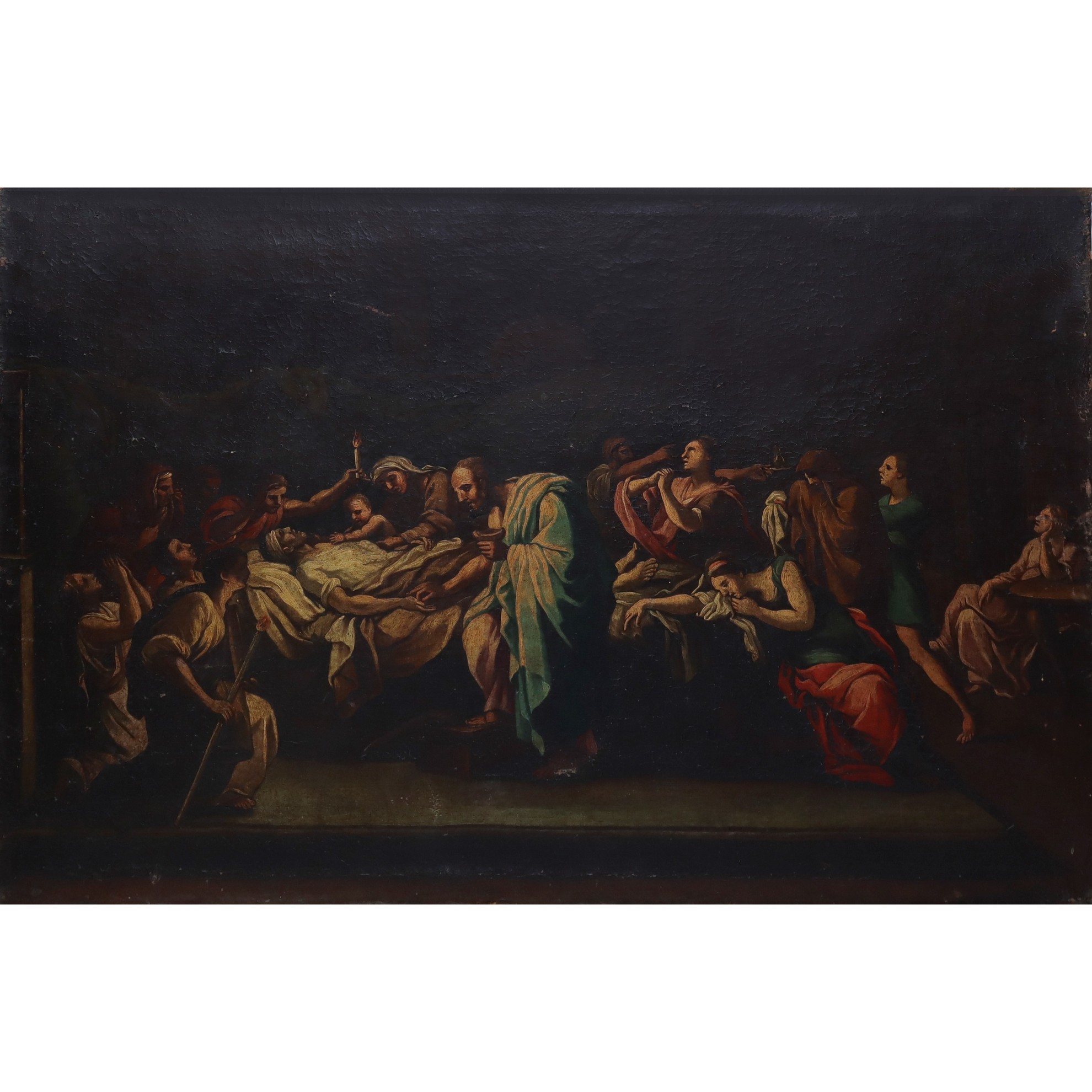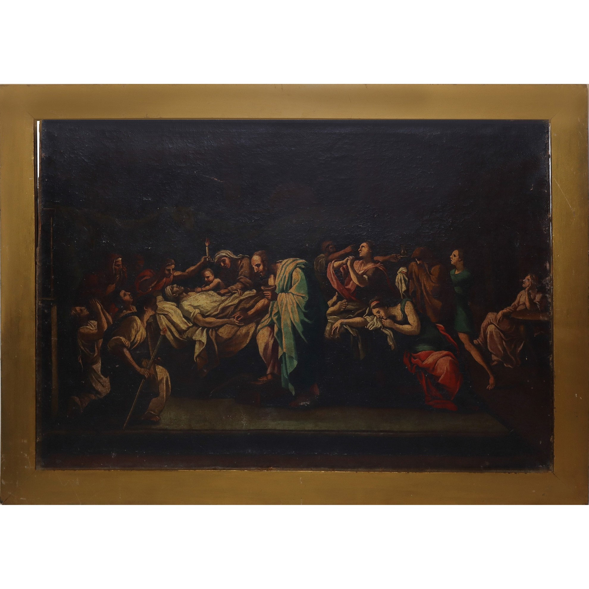 Transito di San Giuseppe con Madonna e Gesù bambino e personaggi, XVIII Secolo H cm 49 x 70 / in cornice 58 x 78 Olio su tela