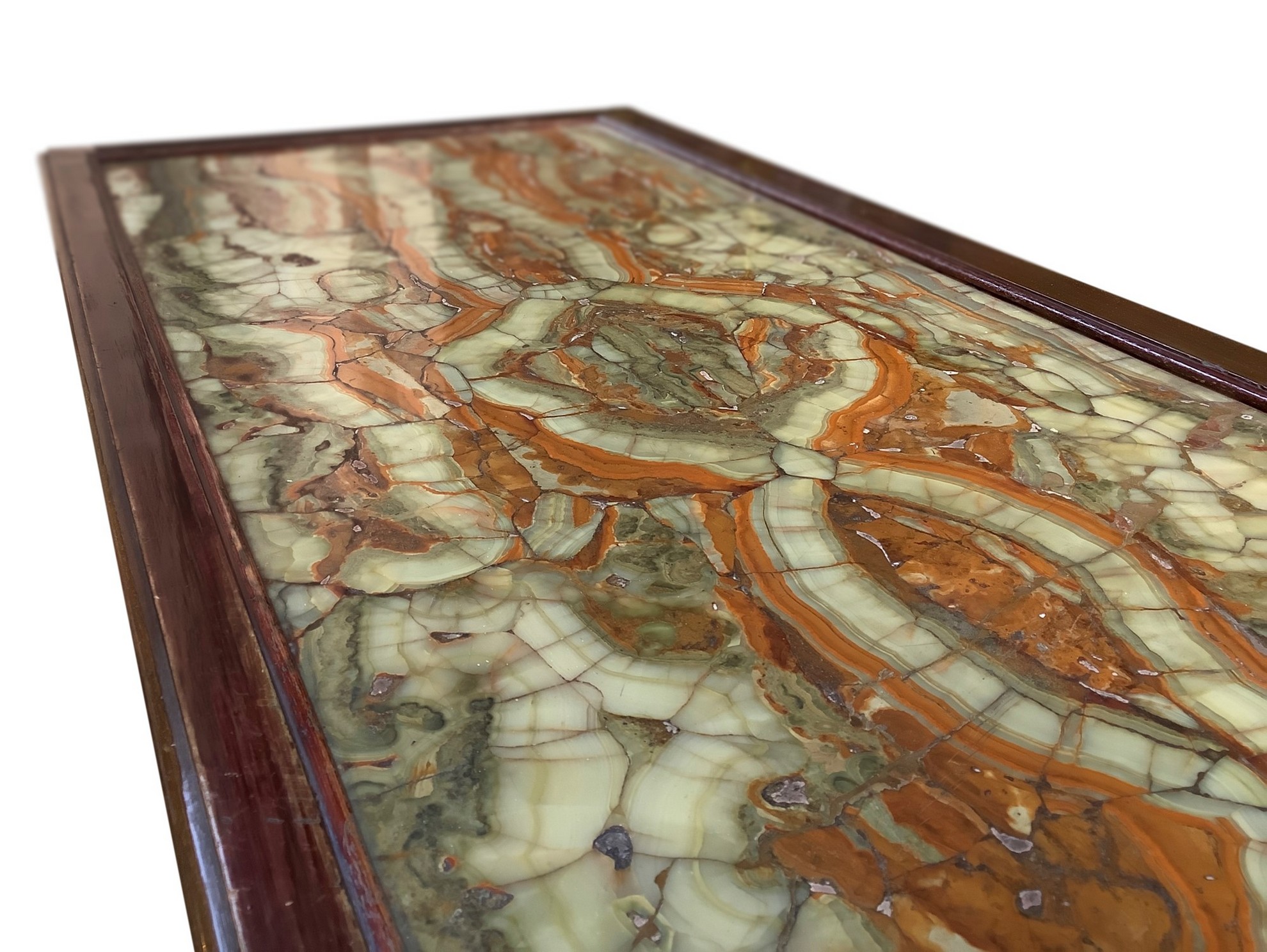 Console in legno di noce, circa 1830 h 105 cm x p 55 cm x l 127 cm Marmo al piano lumachino di Cefalù giallo e verde, cassetto sottopiano e filettature su tutti i bordi in legno chiaro. Provenienza Sicilia. Marmo al piano lumachino di Cefalù giallo e verde, cassetto sottopiano e filettature su tutti i bordi in legno chiaro. Provenienza Sicilia.