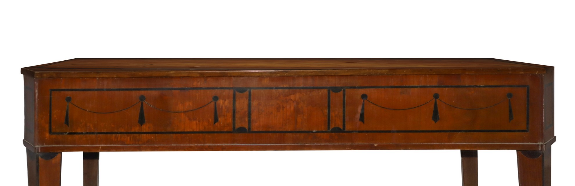 Console Luigi XVI, in legno di piuma di mogano, XVIII Secolo H cm 78x130x55 Intarsi sul fronte in legno nero ebanizzato con ghirlande, piedi tronco piramidali. Maestranze artigiani sicilianeIntarsi sul fronte in legno nero ebanizzato con ghirlande, piedi tronco piramidali. Maestranze artigiani siciliane