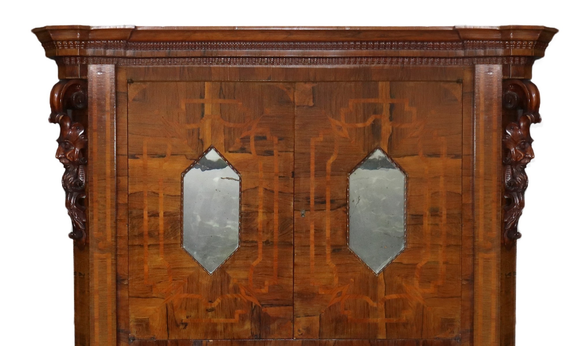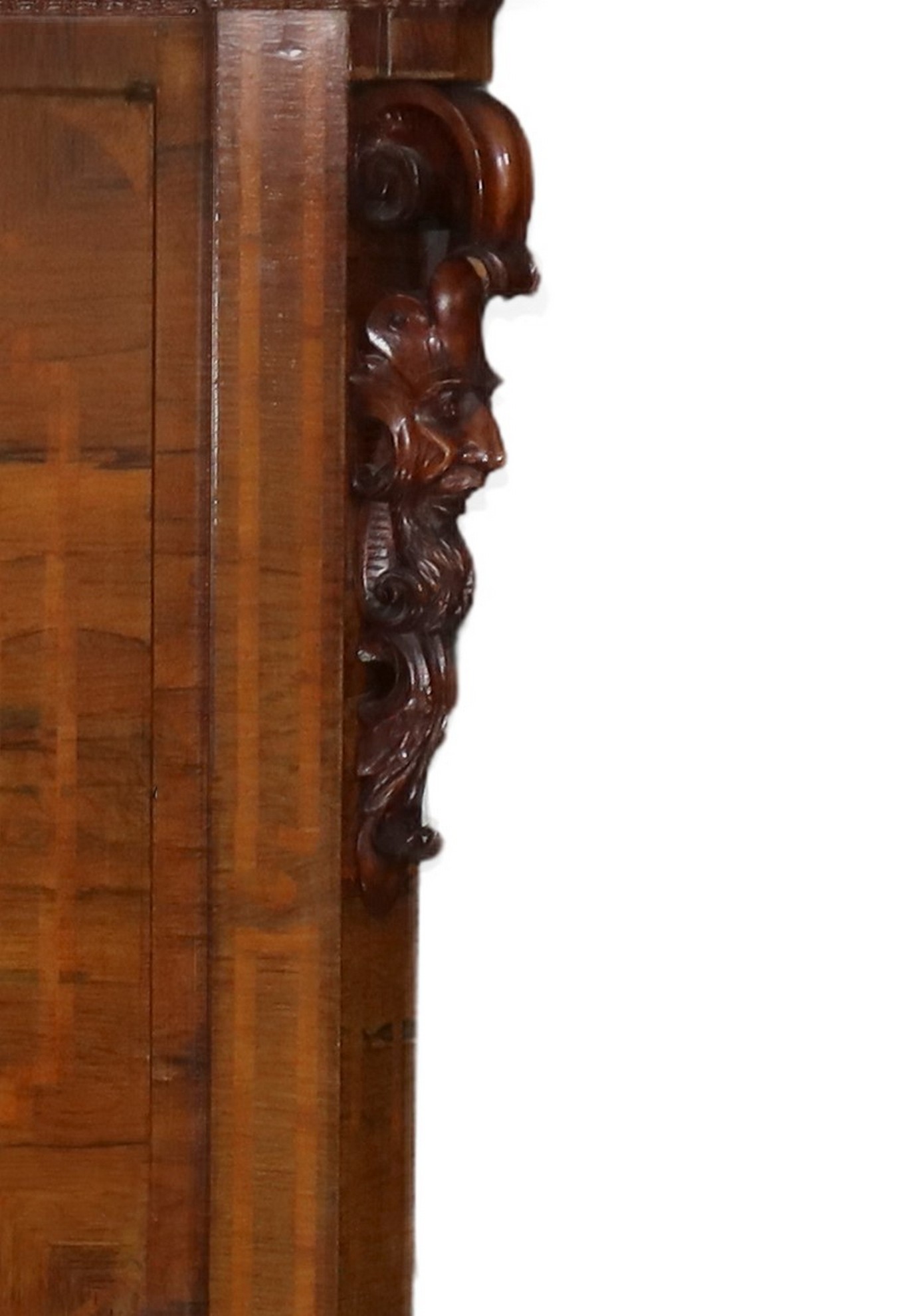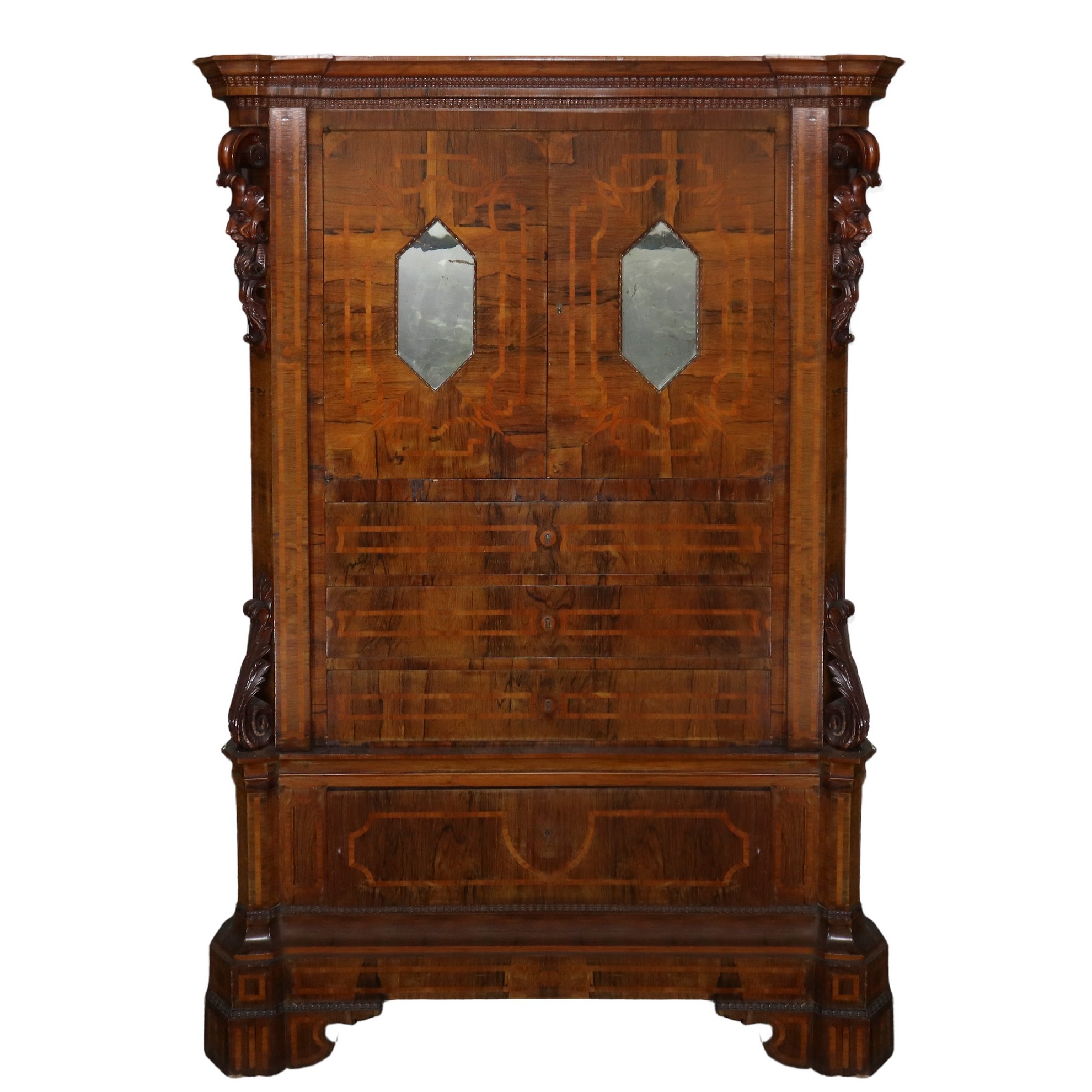 Piccola Sciffoniera in legno, 19° Secolo Sicilia h cm 178 x 125 x 57 Con inserti di Boise de rose, corpo unico parte superiore a due sportelli con specchi centrali a losanga, parte inferiore con tre cassetti più cassetto alla base più grande ,sculture con mascheroni intagliati a foglie ai lati, piedi a mensola.Con inserti di Boise de rose, corpo unico parte superiore a due sportelli con specchi centrali a losanga, parte inferiore con tre cassetti più cassetto alla base più grande ,sculture con mascheroni intagliati a foglie ai lati, piedi a mensola.