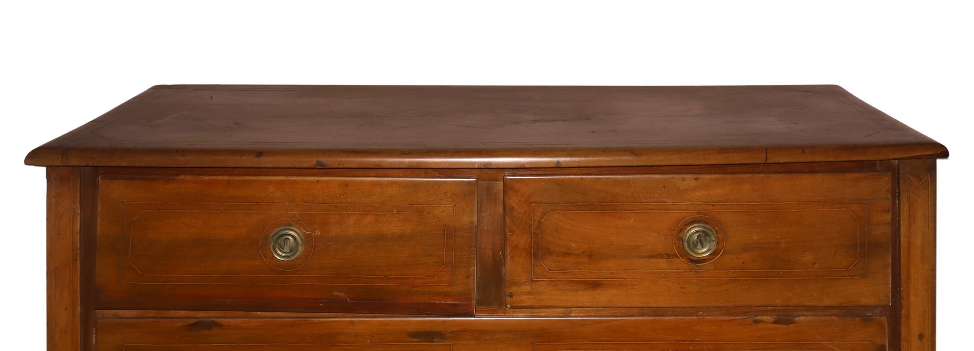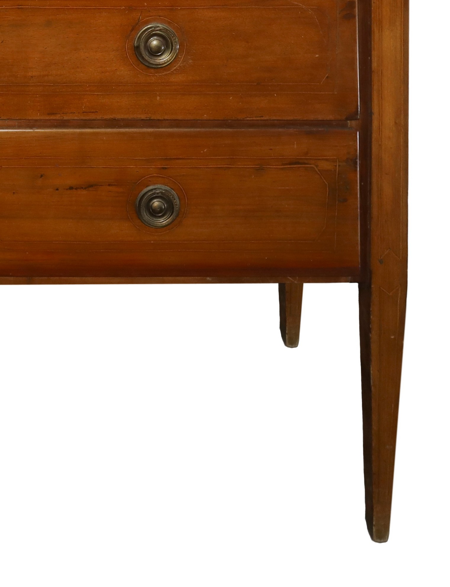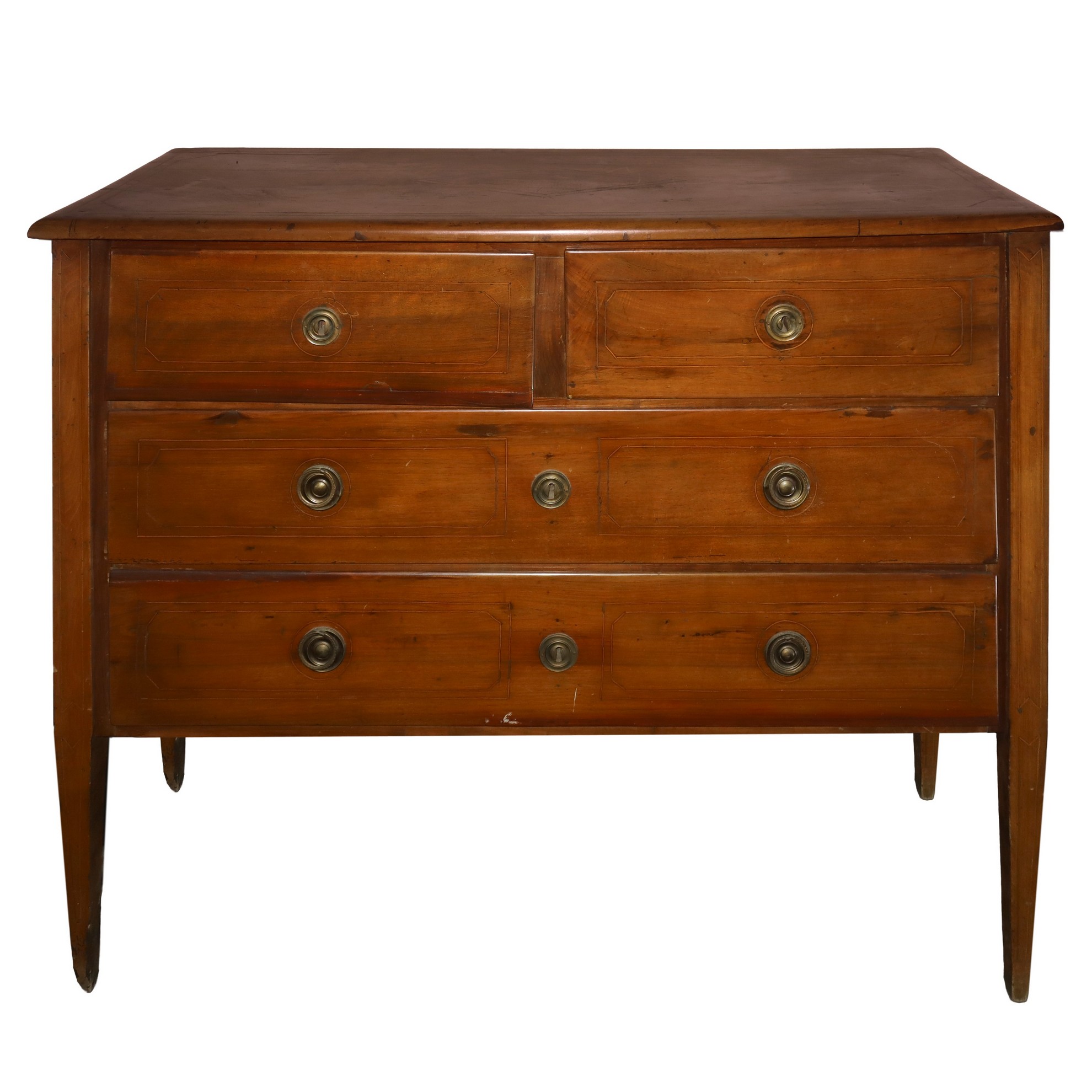 Cassettone in legno Luigi XVI in legno massello di noce, Fine 18° Secolo H cm 103x122x50 Con intarsi filettati in legni chiari sul piano e sul fronte. Due cassetti sottopiano e due grandi. Piedi troncopiramidali. Maestranze artigianali Siciliane. Con intarsi filettati in legni chiari sul piano e sul fronte. Due cassetti sottopiano e due grandi. Piedi troncopiramidali. Maestranze artigianali Siciliane.