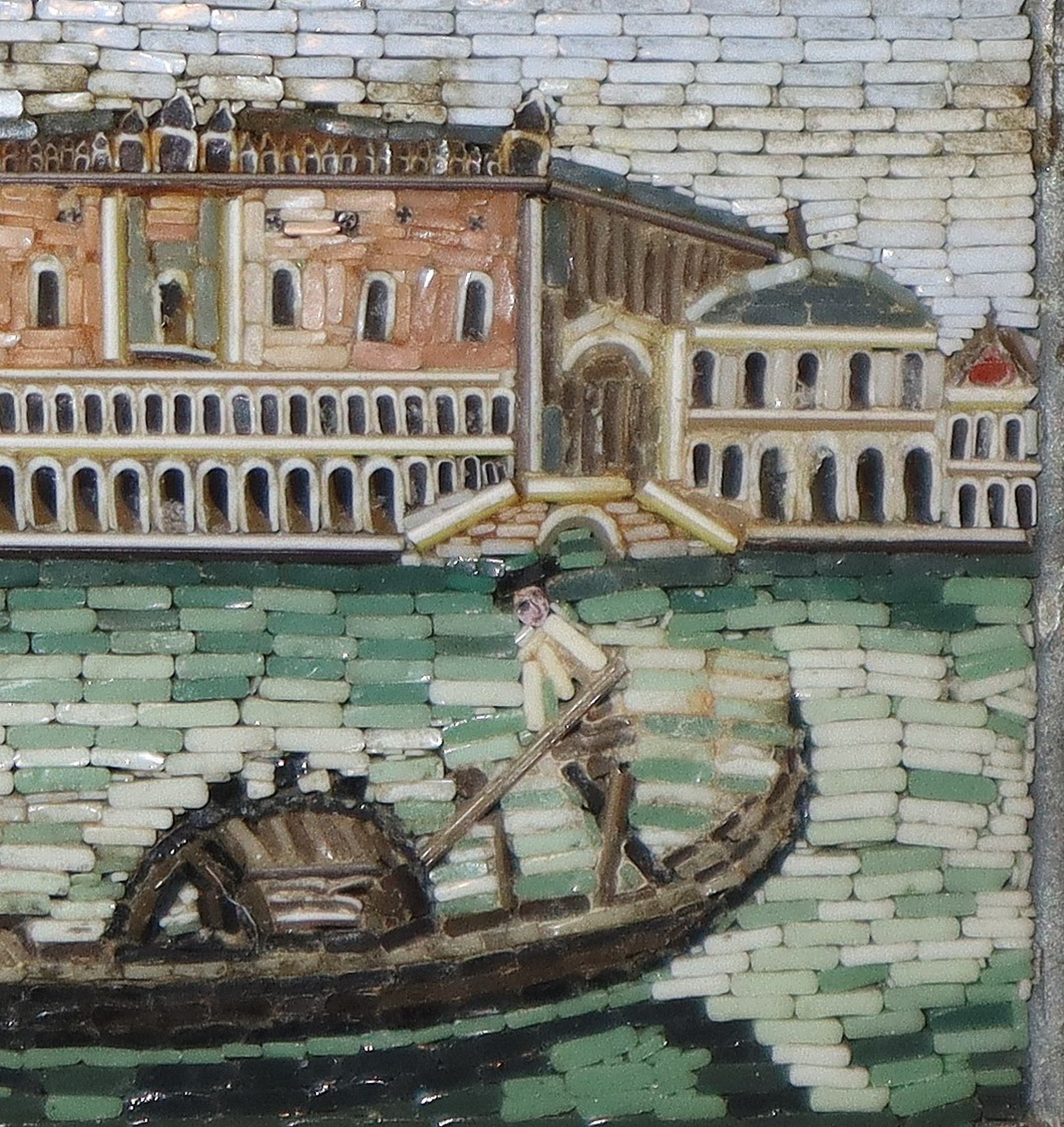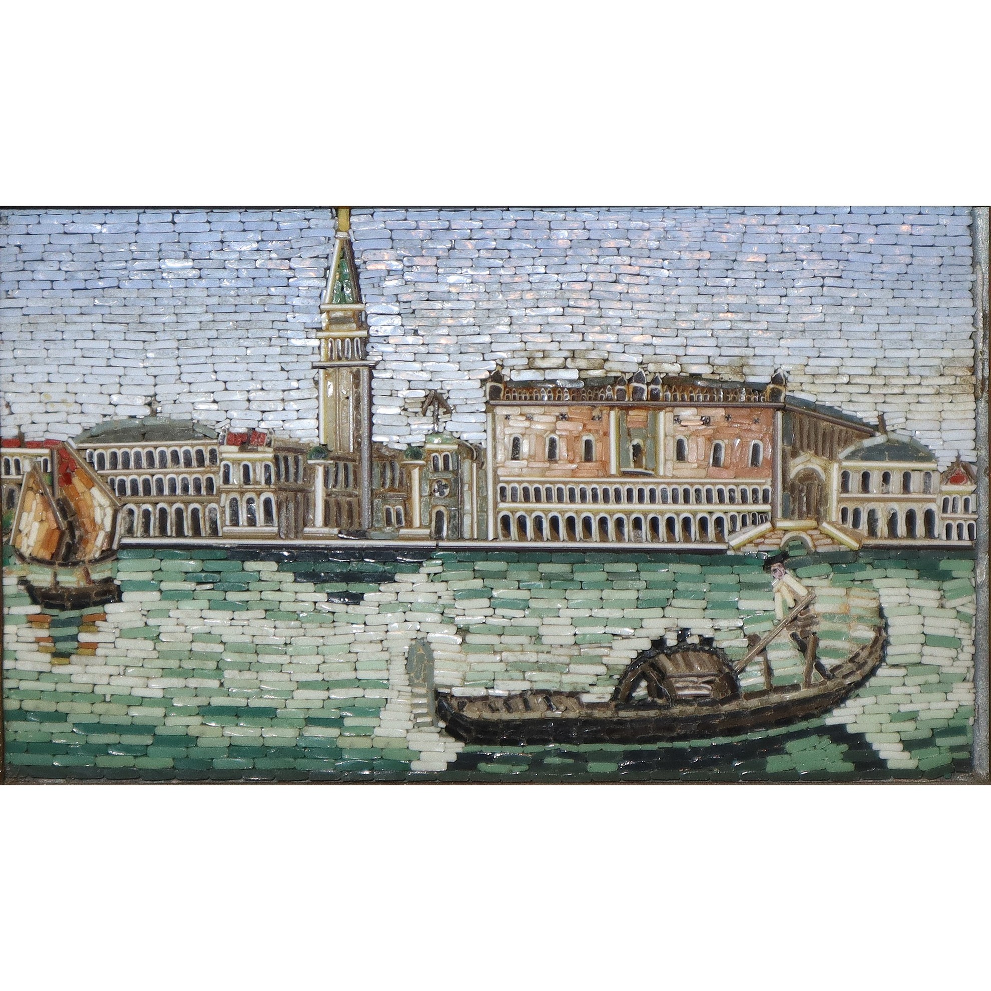 Venezia e gondole, 19° Secolo Cm 8x14, in cornice cm 15x21 Mosaico a commesso con base in metallo zincato